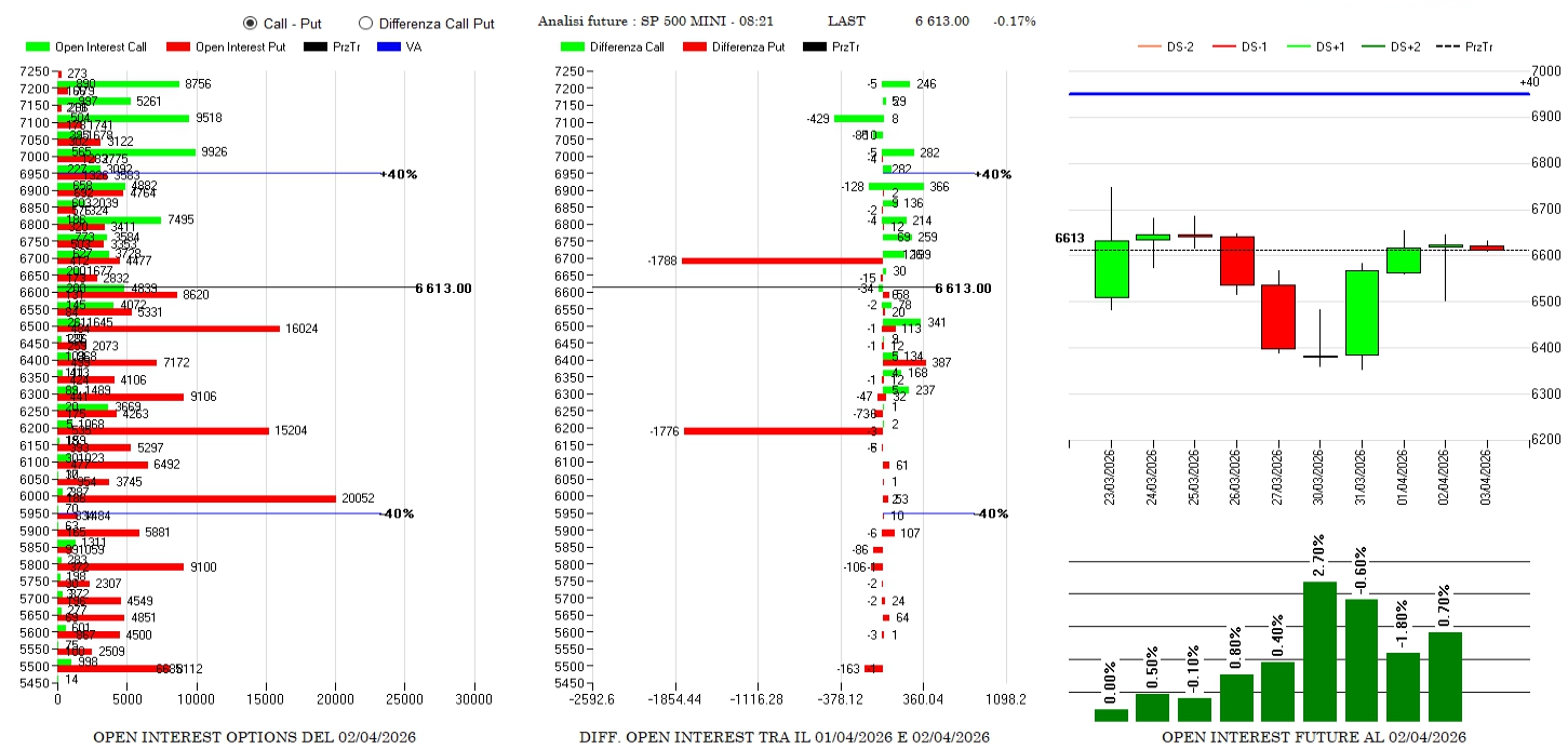 Forti alleggerimenti di put in probabile spread a strike 6200 e 6700 e tanti riposizionamenti di call sopra alò prezzo. Future in lieve aumento e prezzo posizionato nel cuore della ripartizione.