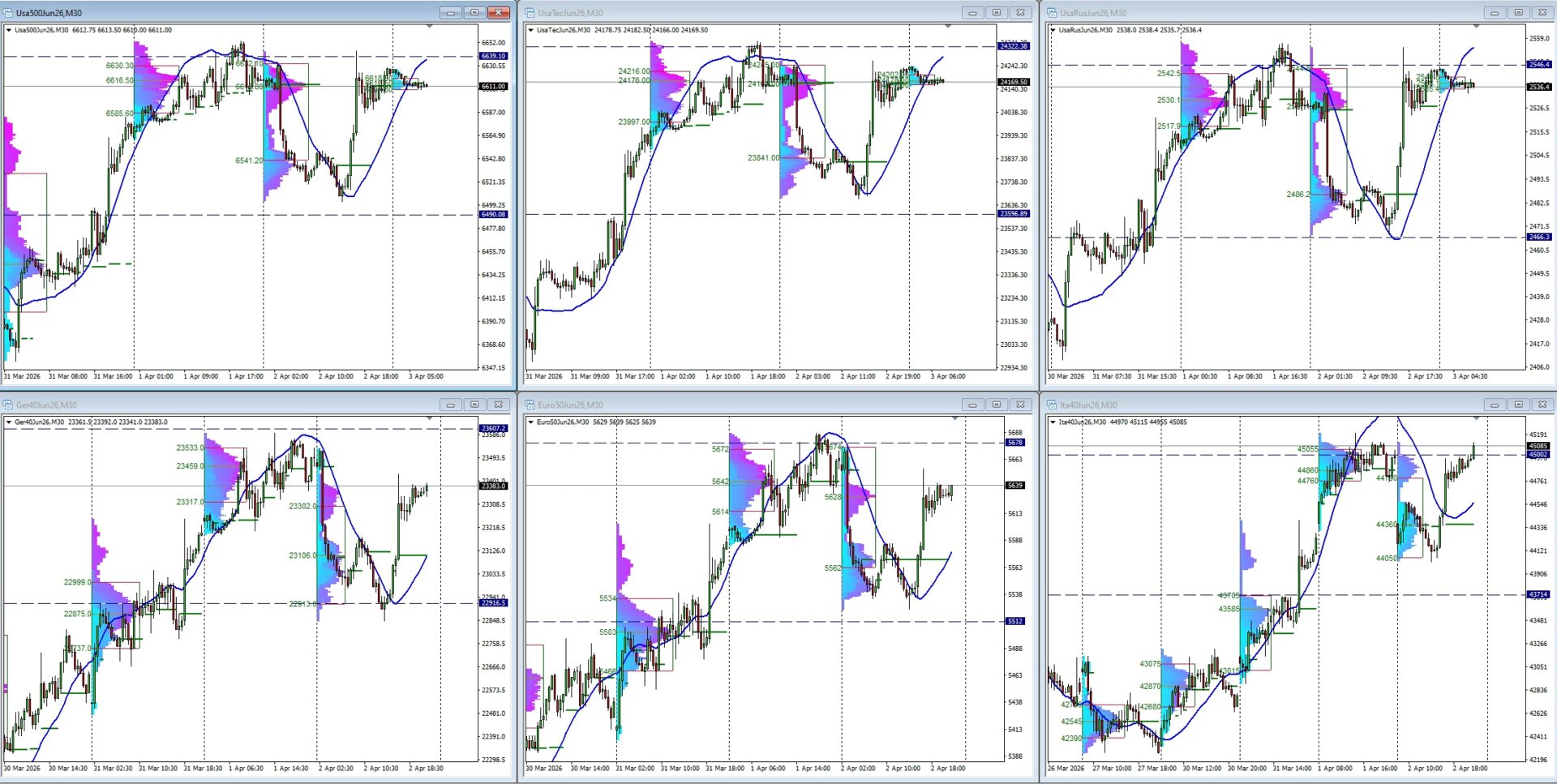 Nonostante l’iniziale sconcerto per le dichiarazioni del Presidente Trump su una possibile escalation del conflitto in Medio Oriente — che avevano spinto i future in deciso ribasso — l’attività di acquisto è tornata prepotente in prossimità dei supporti critici. Nella giornata di ieri S&P 500 e Nasdaq hanno rapidamente recuperato il terreno perduto, riportandosi all’interno delle Value Area superiori e puntando nuovamente ai Poc più elevati della settimana. Anche il Russell riflette questo ritorno di fiducia, annullando la debolezza iniziale e stabilizzandosi su livelli di prezzo ambiziosi. In Europa, il Dax, l’Euro Stoxx 50 e il Ftsemib seguono la scia del recupero americano, scambiando sopra i minimi di apertura e dimostrando una capacità di assorbimento delle notizie negative superiore alle attese.