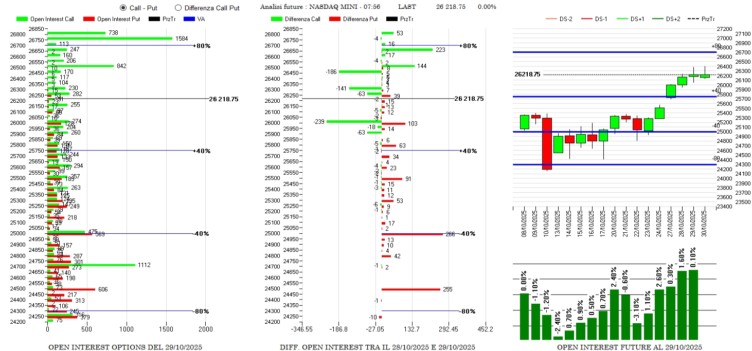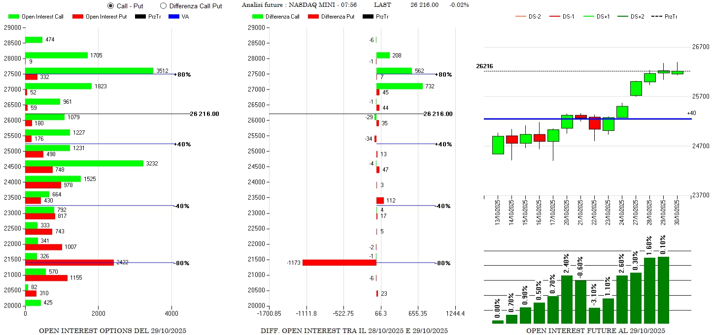 Future che continuano a rimanere in forte pressione in funzione di ricopertura e call che vengono alleggerite da strike 26000 a strike 26450 e rollate a 26500 e 26650. Put in aumento da 24500 a 26650
