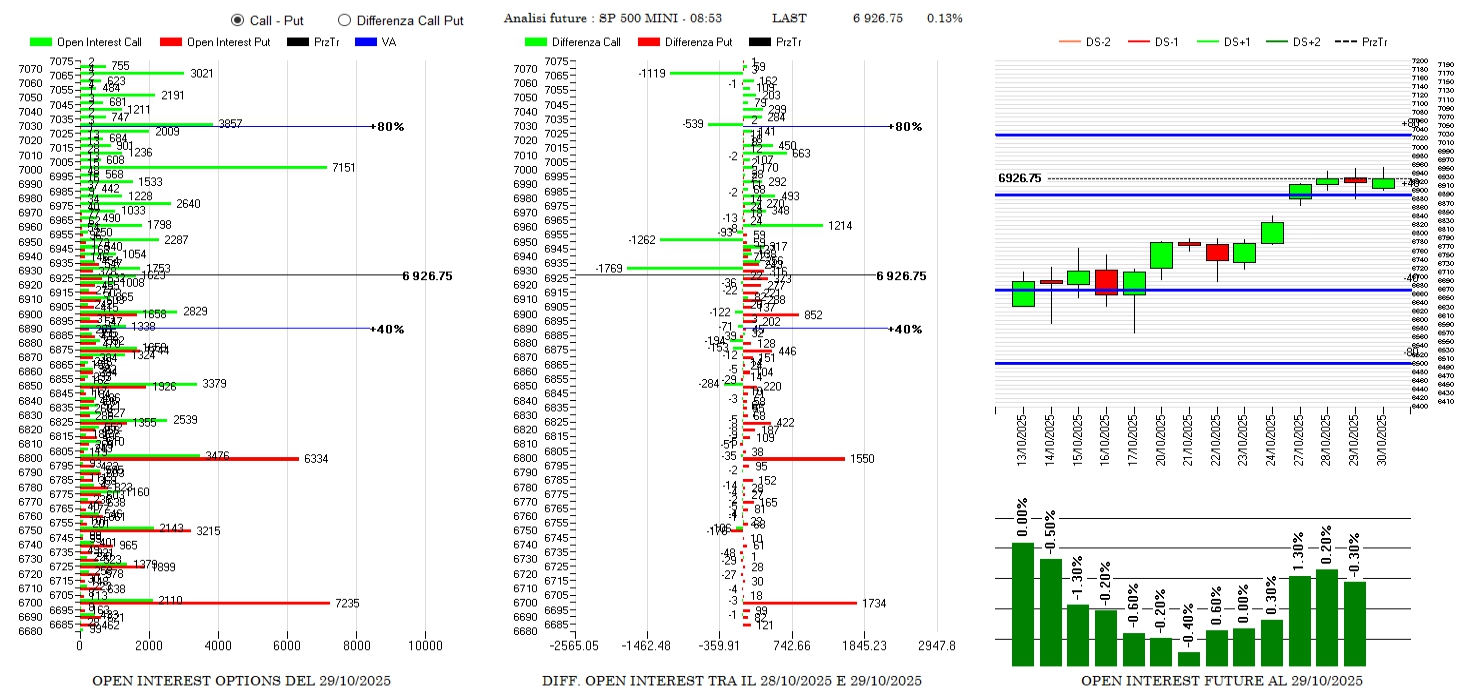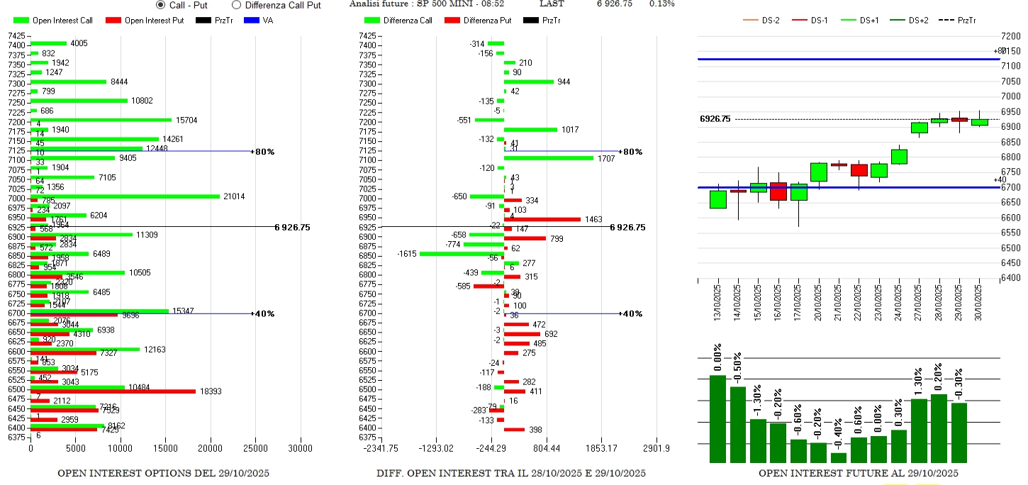 Chiusure di call a 6930 e 6950 riposizionamenti sopra 6960. Sul lato put sempre nuovi ingressi sotto al prezzo però non seguiti da aumenti di future che subiscono un lievissimo calo percentuale.