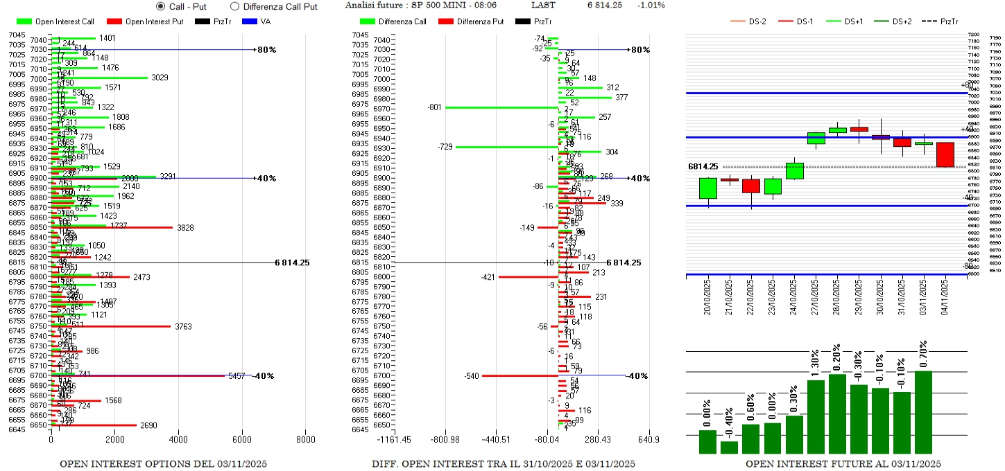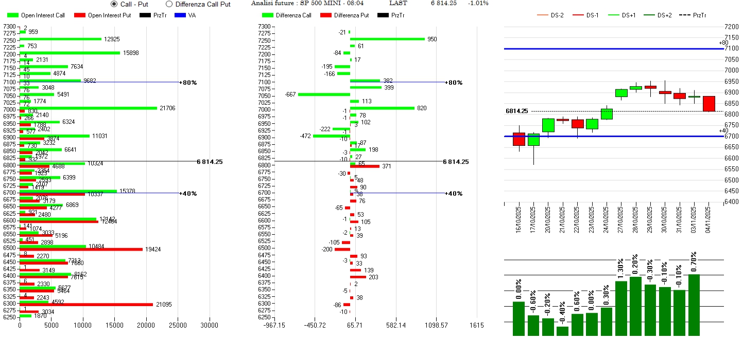 Mercato centratissimo nel cuore della ripartizione e future che, sulla debolezza, aumentano di +0,7%. Sul lato opzioni sono evidenti chiusure di put a 6800 e 6700 e chiusure di call a 6930 e 6970. Per il resto solo piccoli riposizionamenti e area 6850, che faceva da spartiacque, diventati Itm.