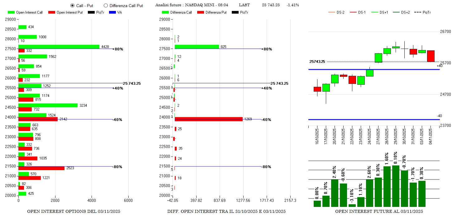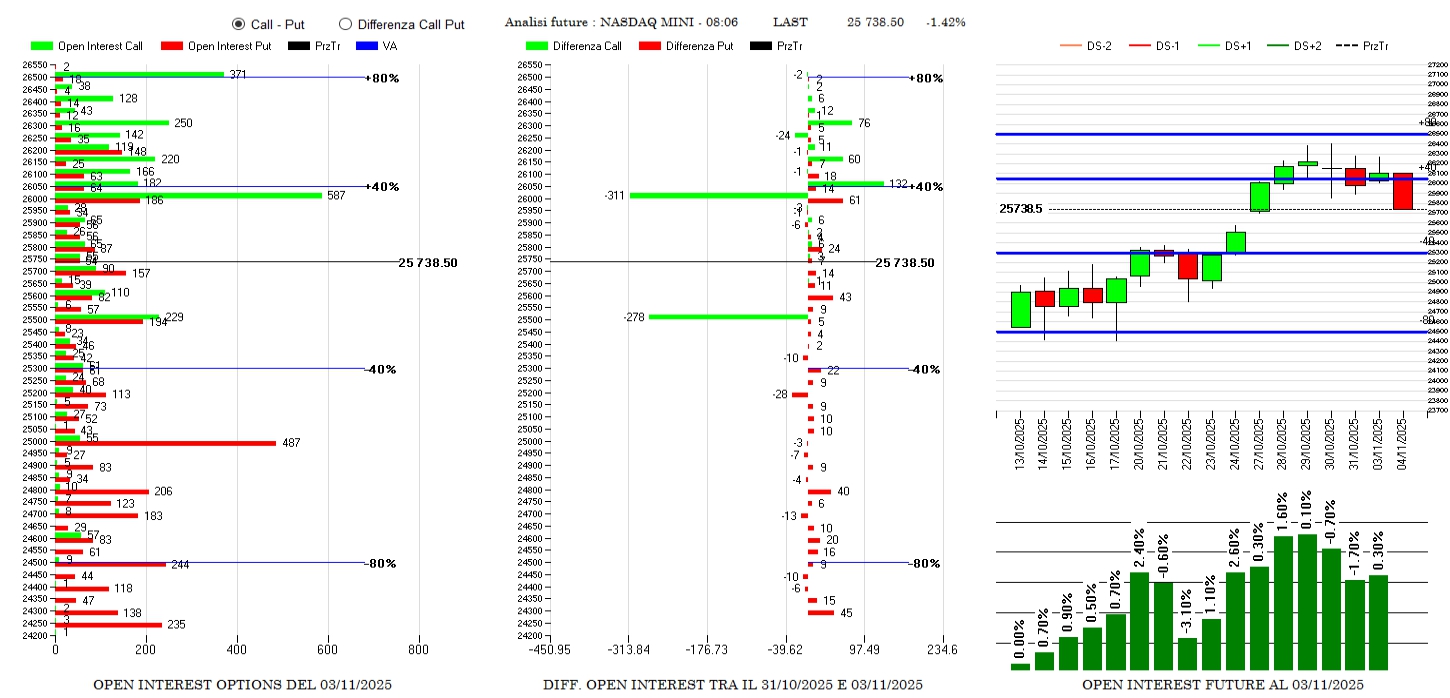 Anche qua mercato centratissimo sulla ripartizione che evidenzia solo chiusure di call Itm a 25500 e Otm a 26000, future senza variazioni di sorta.