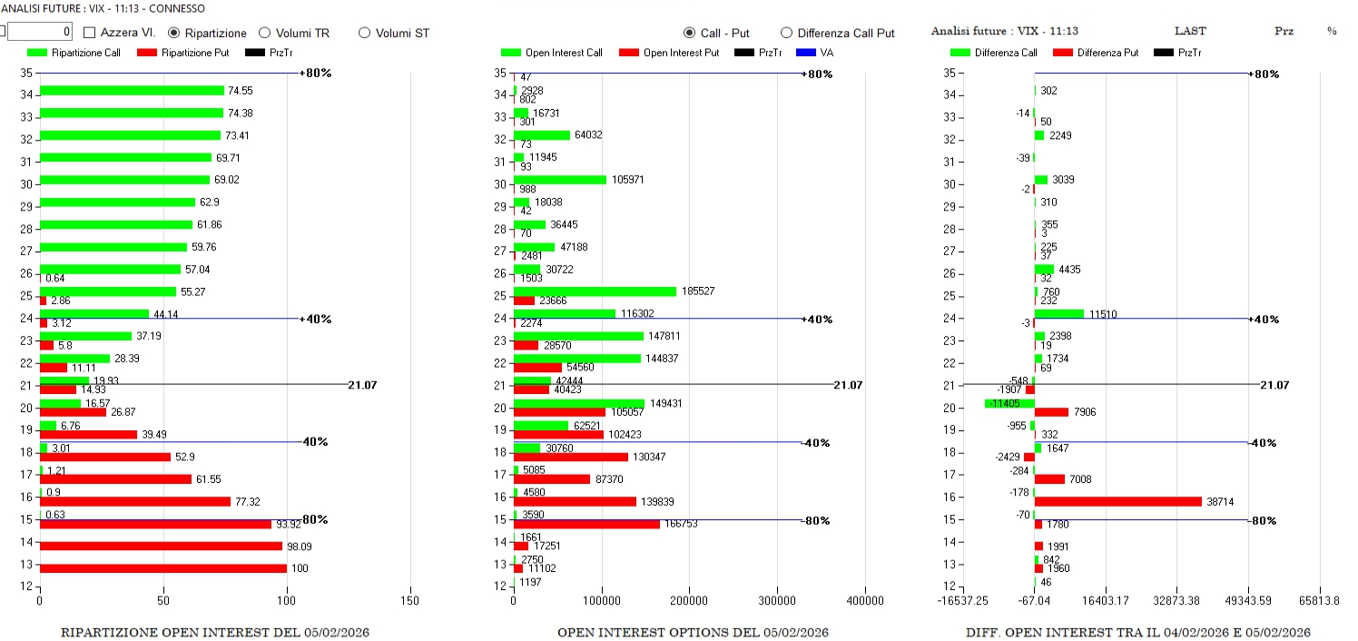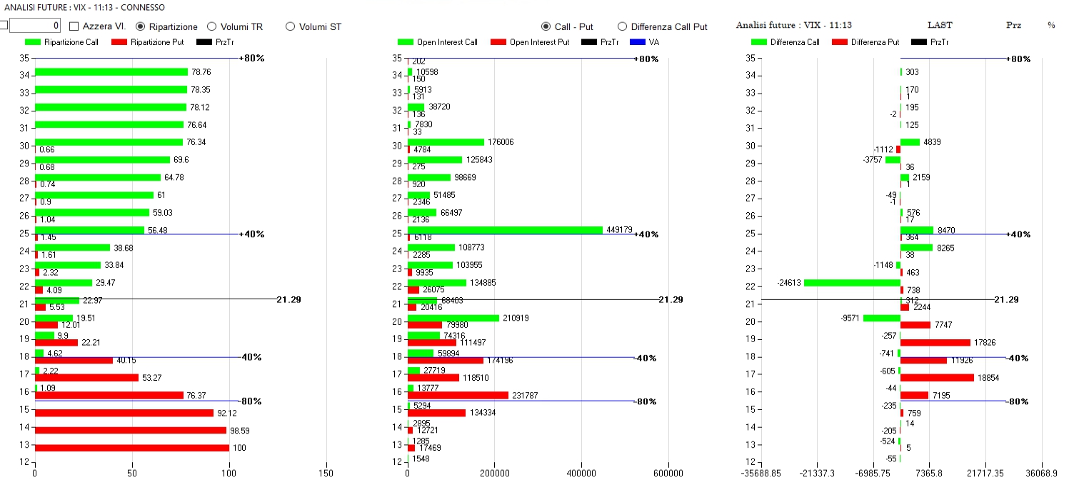 Dopo mesi di Vix confinato sotto Va-40, finalmente lo rivediamo nel cuore della ripartizione dopo il piccolo rialzo del giorno precedente. Sulle opzioni sono state chiuse molte call a strike 22 e 20 e riparte tra 30 e 24 mentre sul lato put si registrano solo copiose nuove aperture tra 20 e 16 a conferma della richiesta di coperture.