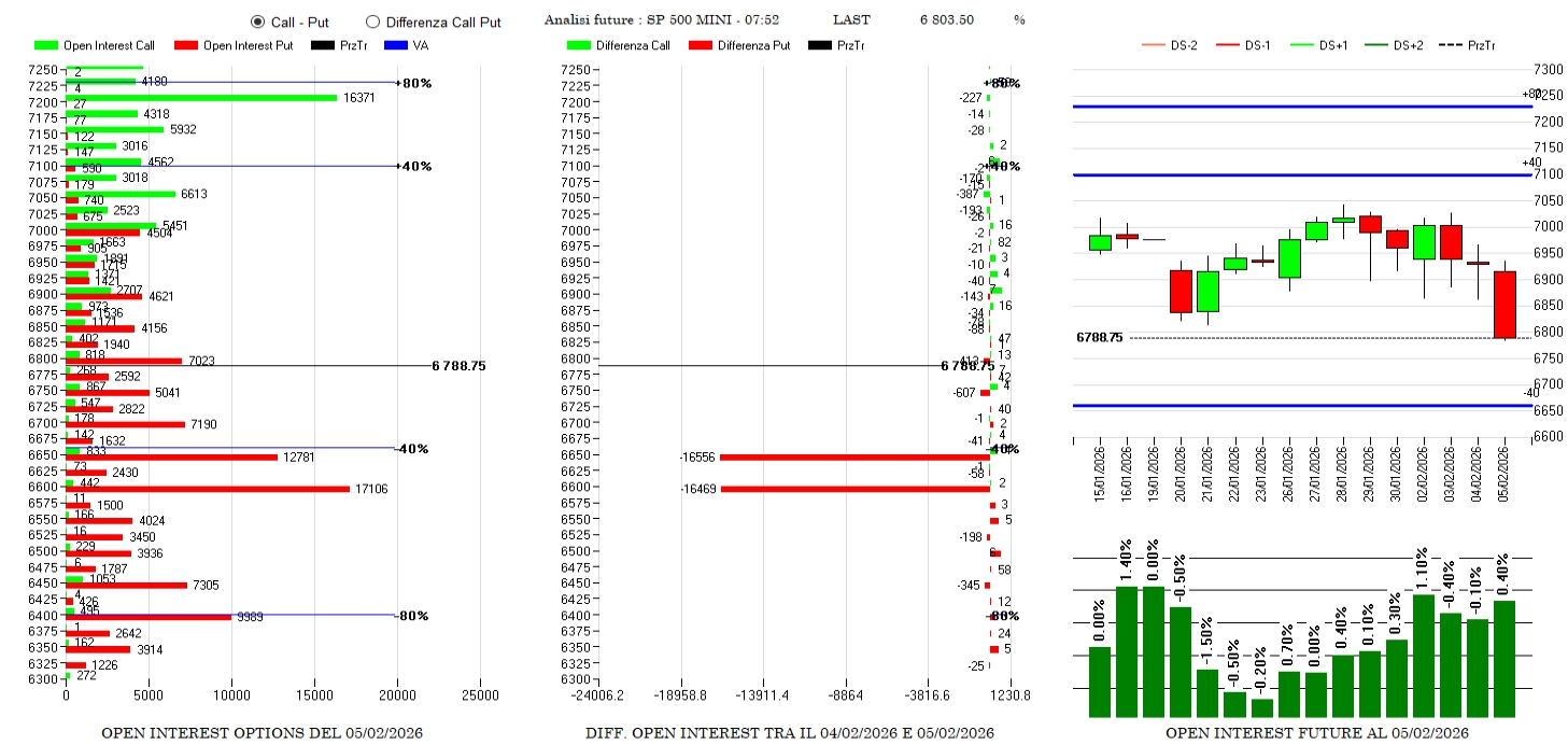 Mercato che rompe un importante supporto e componente future che inizia ad aumentare. Sul lato opzioni sono evidenti le chiusure di notevoli quantità di put a strike 6650 e 6600 mentre sul resto della chain non viene toccato quasi niente.