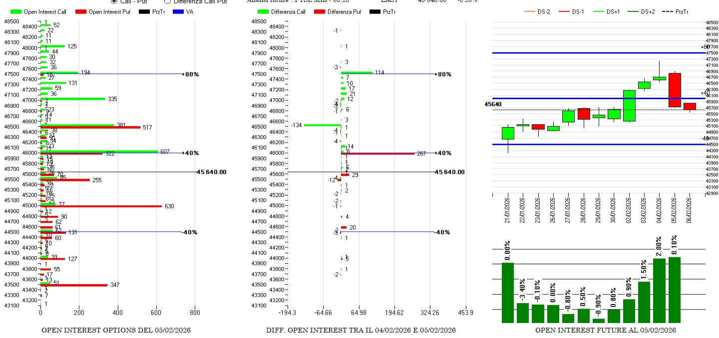 Veloce discesa del Ftsemib che, in due giorni, passa dal toccare Va+80 a rientrare all’interno della propria area di indifferenza con primi livelli di supporto di gamma a 45500 ma soprattutto a 45000. Nella giornata di ieri sono aumentate le put a strike 46000 mentre sul lato call si è assistito ad un anomalo rollover esterno con chiusure a strike 46500 e nuove aperture a 47500. Future sempre in forte pressione ma senza differenze significative con il giorno precedente.