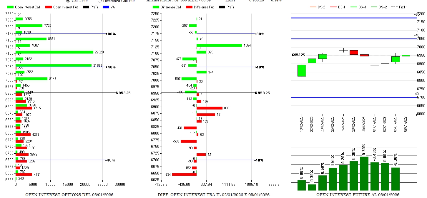 Rollover interno di put a conferma di supporti con chiusure a 6650 e 6825 e nuove aperture a 6900 e 6875. Rollover esterno di call con riposizionamento delle resistenze con chiusure a 6950 e 7050 e nuove aperture a 7125. Future in lieve calo a conferma che i prezzi si trovano in area di equilibrio dove l’intervento dello strumento lineare non è molto richiesto.