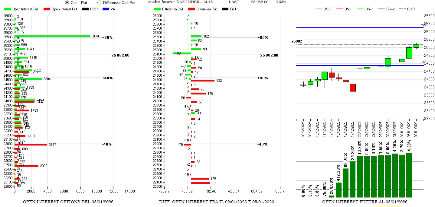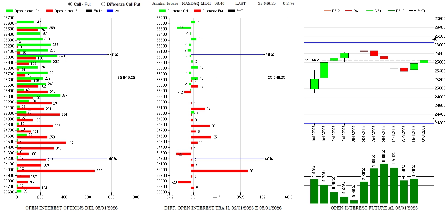 Riposizionamenti di put tra 25500 e 24000 e piccoli ingressi di call a 25600 e 25800 a cui fanno seguito minime chiusure a strike superiori. Future stabili e numericamente bassi.