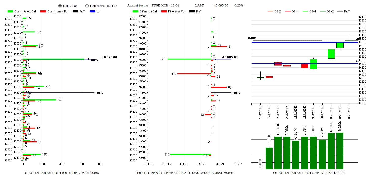 Forti chiusure di call, sia Itm a 42500 che Atm a 46100 e riposizionamenti di put con chiusure a 45500 e nuove aperture a a 45000 e 46500. Future ancora in aumento su Va+80 e sulla ennesima rottura in break dei massimi.
