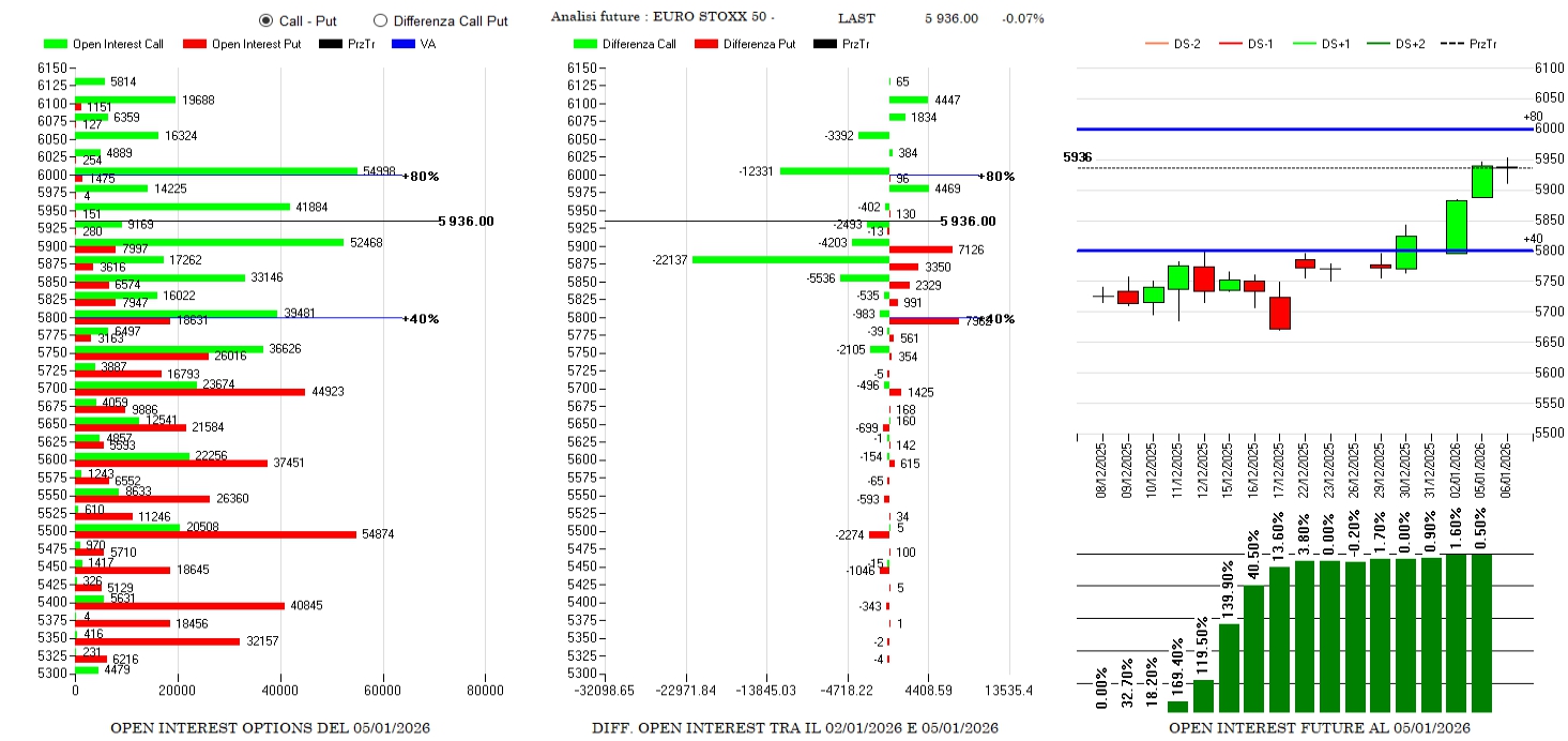 Enormi chiusure di call da strike 5850 a 6000 e piccoli riposizionamenti a 6100. Put in aumento tra 5900 e 5800 insieme ai future che segnano +0,5% in funzione di copertura delle tante call che stanno andando Itm