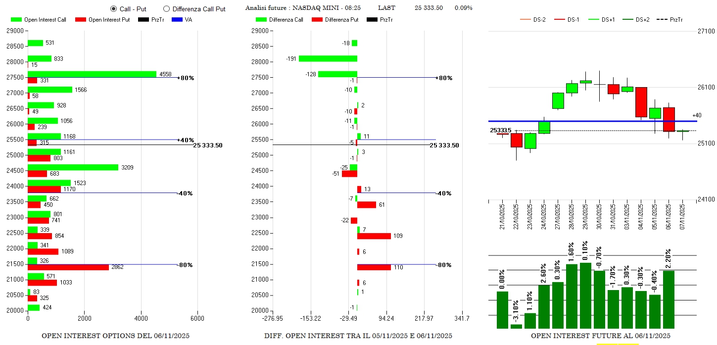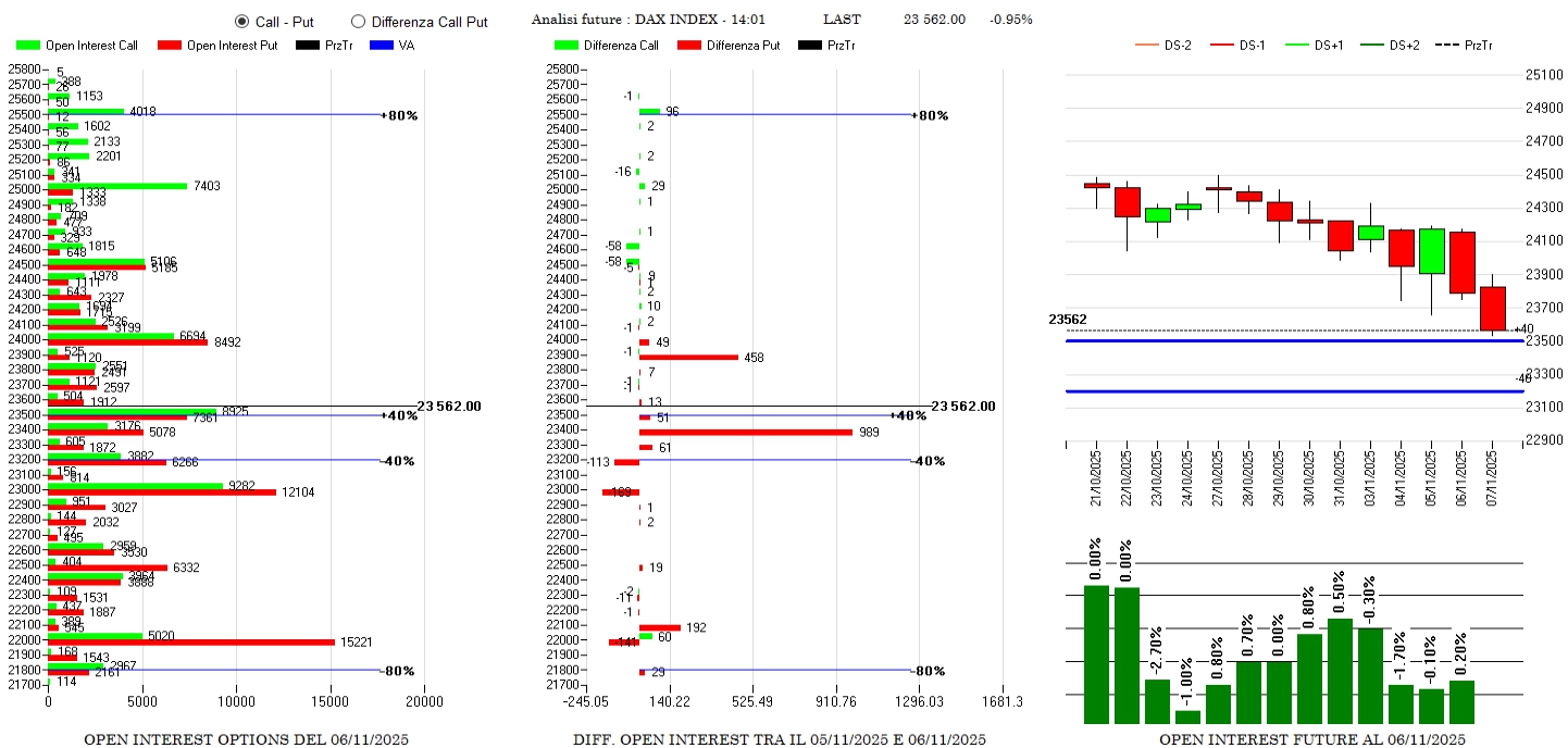 Sulla breakout di Va+40 si assiste ad un netto aumento di future insieme a chiusure di call a strike 27500 e 28000 contemporaneamente a nuovi ingressi di put tra 23500 e 21500