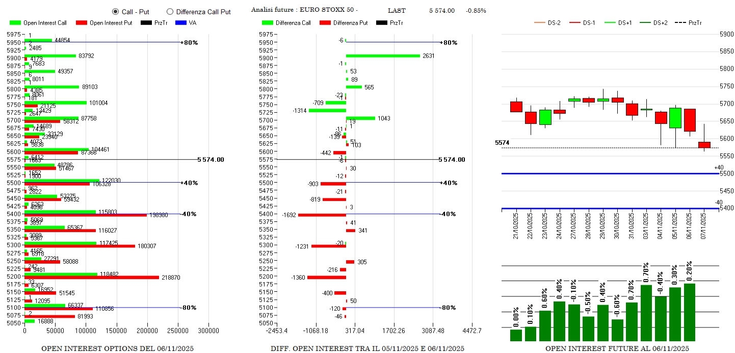 Come nei momenti classici di paura si assiste a chiusure indifferenziate di put da strike 5600 a 5150 e riposizionamenti di call a 5900 e 5800. Future in lieve aumento.