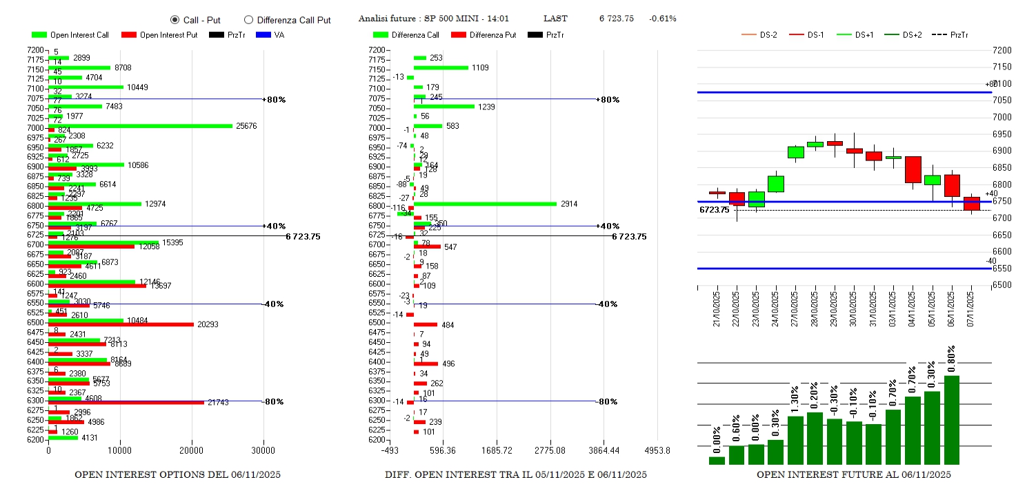 Sul lato opzioni si assiste a riposizionamenti di call tra 6800 e 7150e a forti cumulati in ingresso a strike 6800. Sul lato put continua solo piccoli riposizionamenti sotto al prezzo