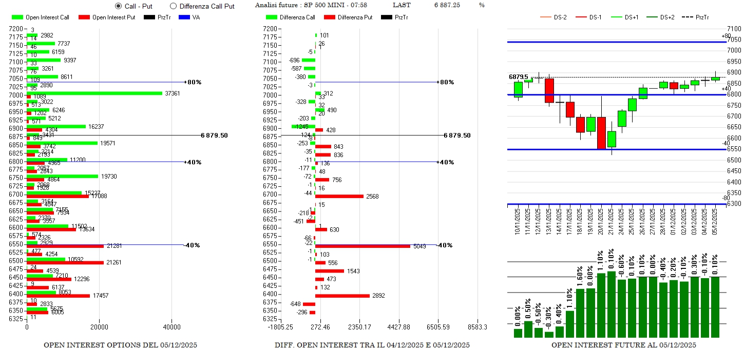 Continuano le chiusure di call da strike 6850 a strike 7100 e i riposizionamenti di put tra 6850 e 6400 insieme a future in pressione long con prezzi sopra Va+40