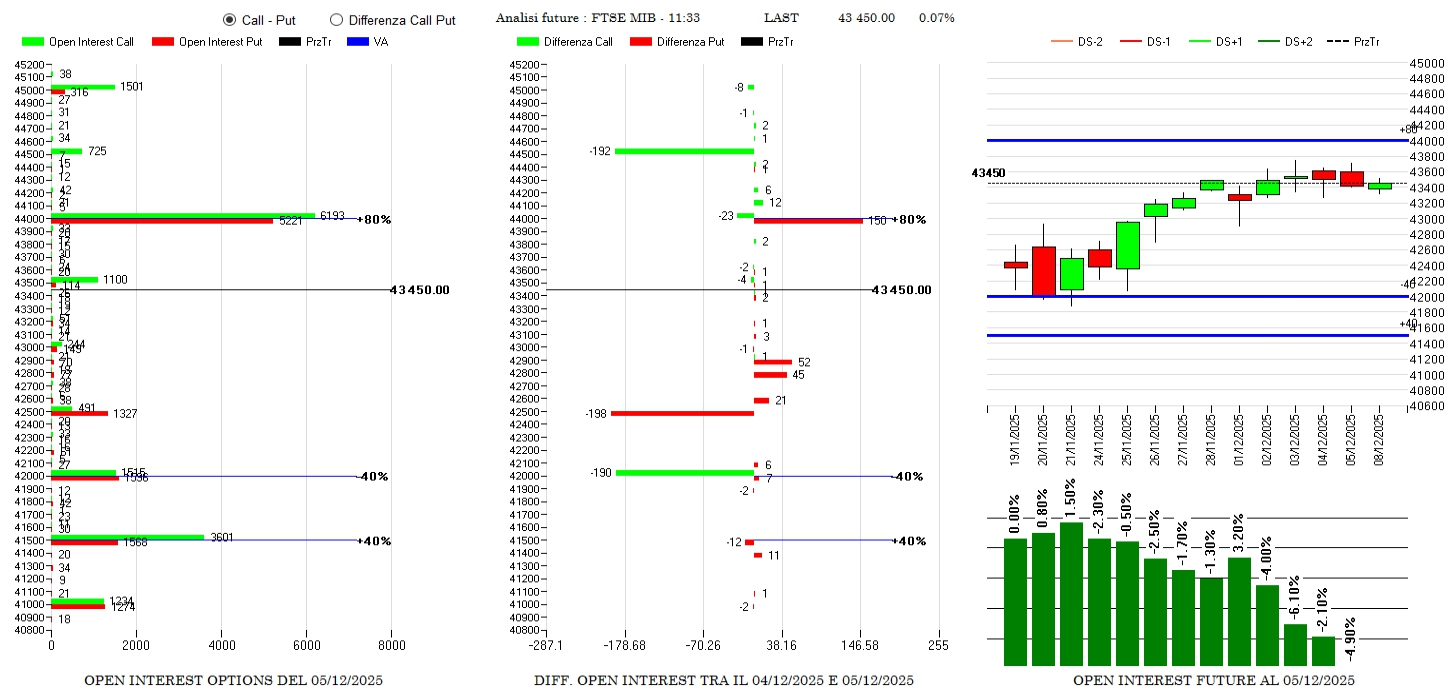 Diminuzione importante della componente future che di fatto diminuisce il momentum rialzista. Sul lato opzioni vediamo chiusure di call Itm e Otm e riposizionamenti di put sia a 42900 che Itm a 44000.