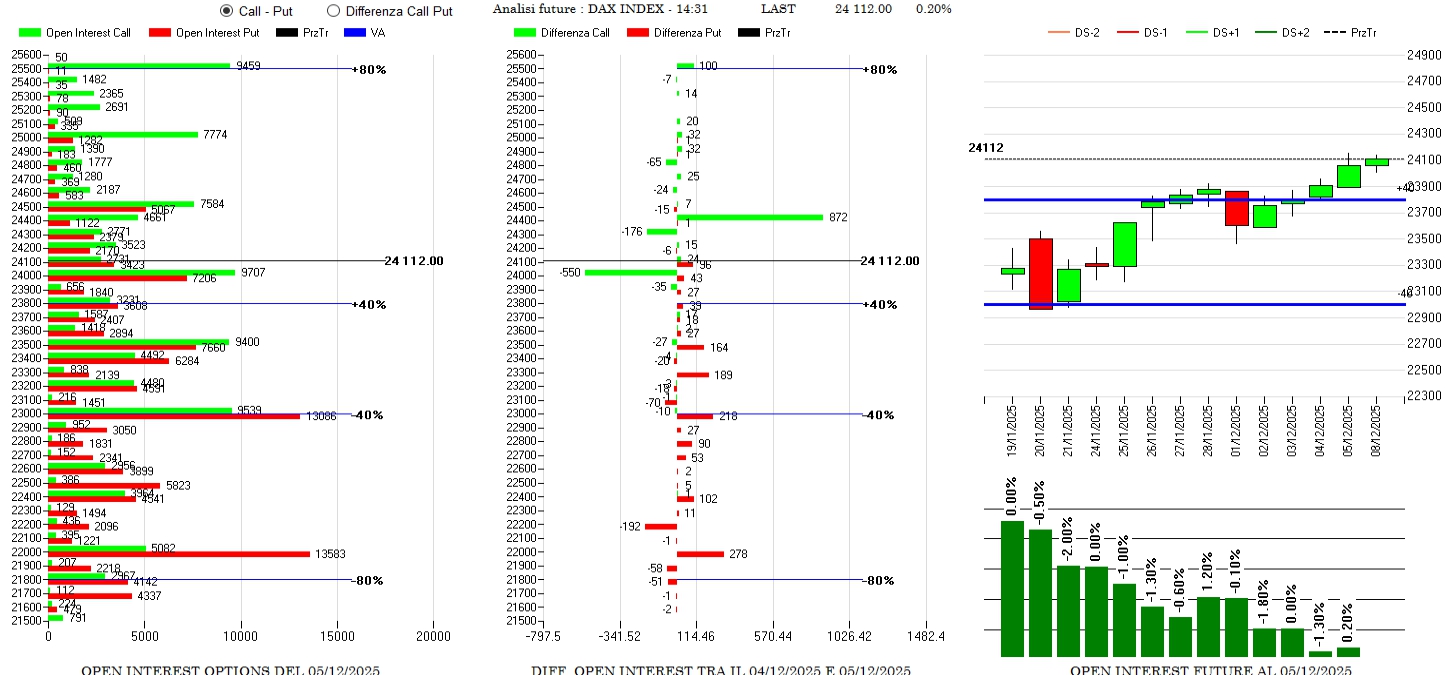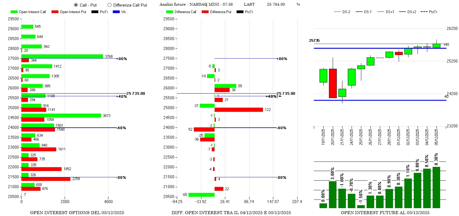 Aumentano future a copertura dei primi livelli di gamma sul lato call e contemporaneamente aumentano put in area 25000, vengono alleggerite call e creata un’area di ricopertura sintetica a 26000.