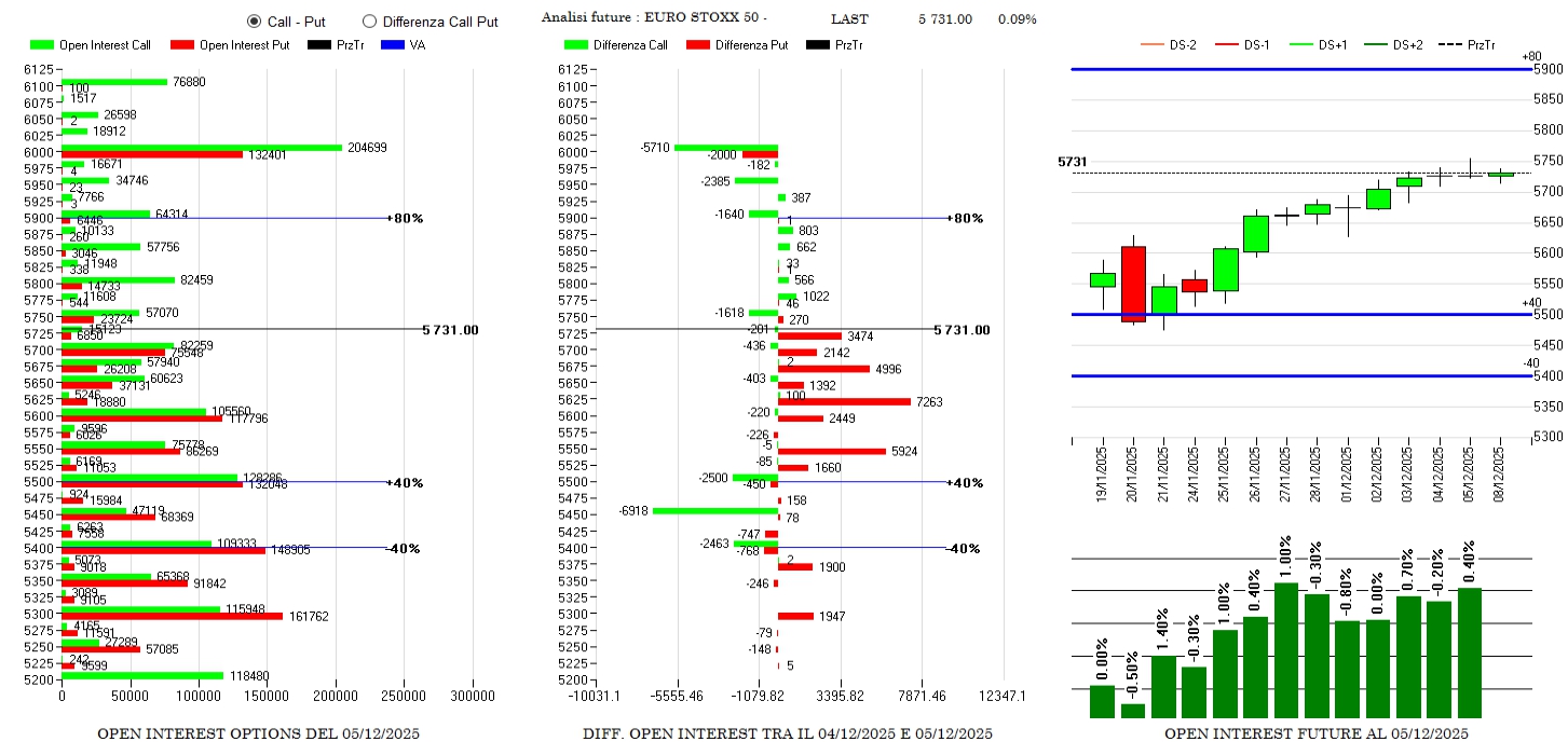 Continuano gli incredibili segnali di forza di Stoxx50 con tante chiusure di call un pò dappertutto, aumenti di future con prezzi arrivati oltre il 60% della ripartizione in forte delta positività e aumenti esponenziali di put da 5725 a 5550