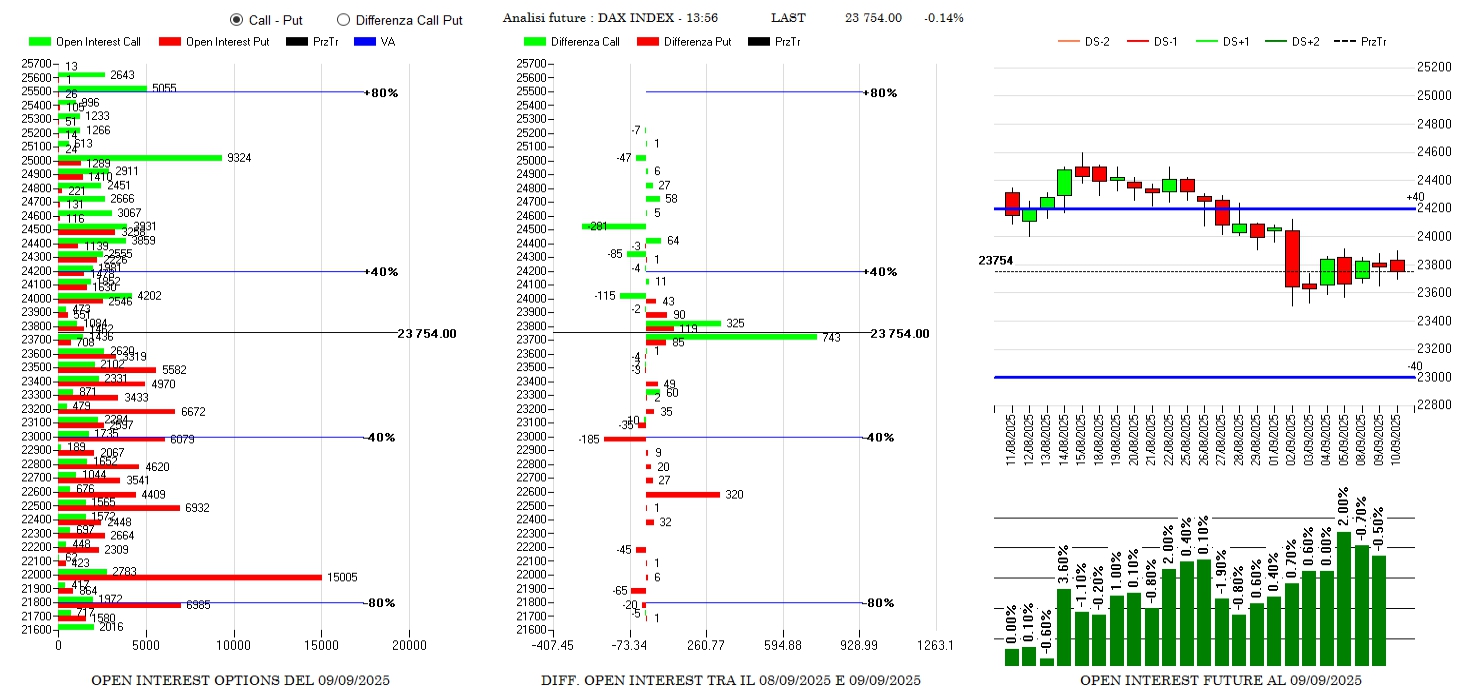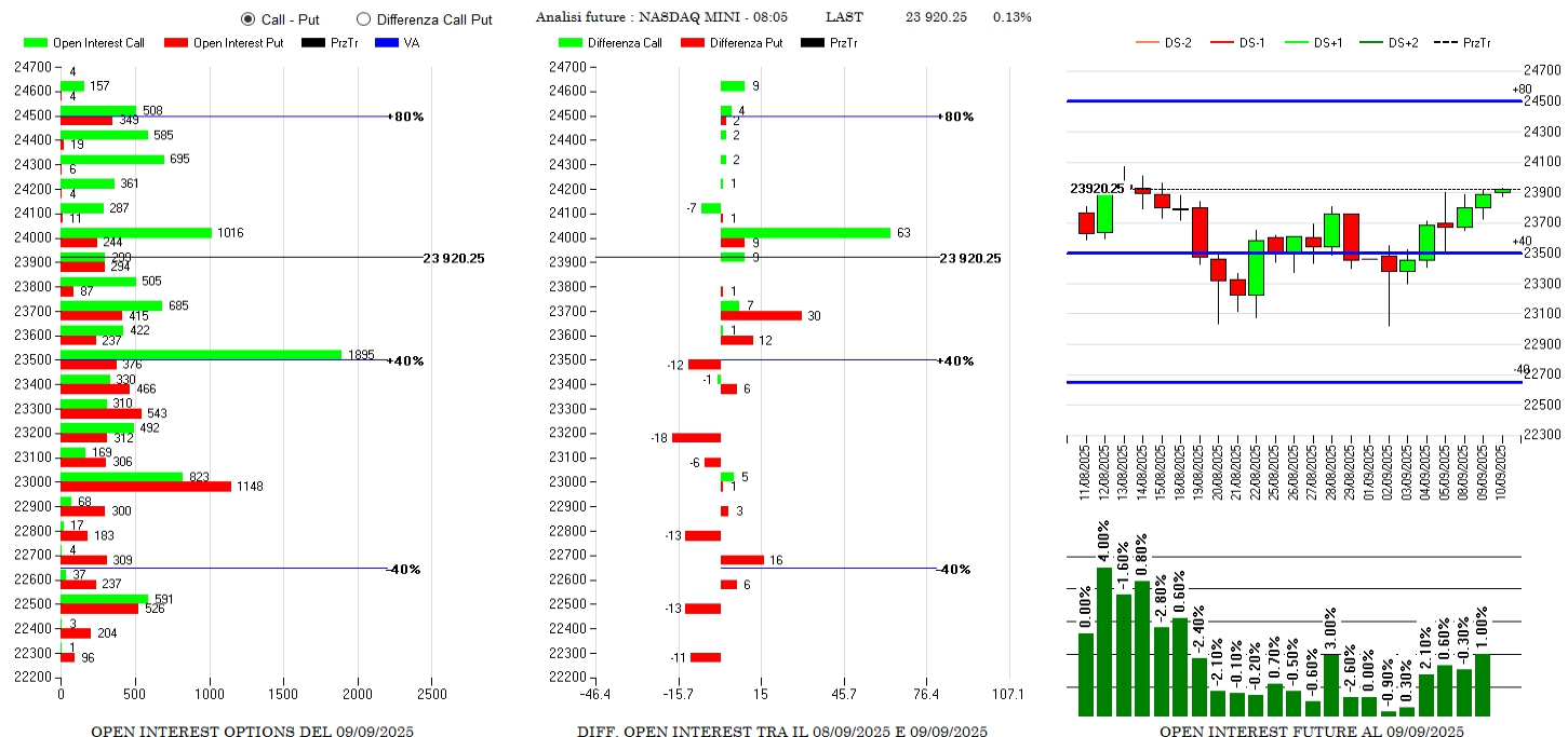 Rollover interno di put con chiusure otm e aperture a ridosso del prezzo in area 23700. Call in aumento a strike 24000 e future in aumento del +1%.