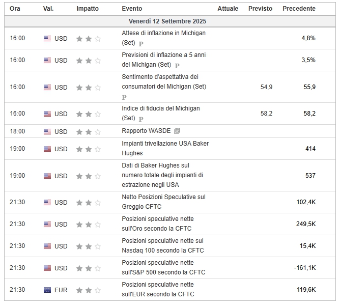 L’11 settembre 2025, i principali indici azionari hanno chiuso in positivo con un clima di fiducia sui mercati. L’S&P 500 ha guadagnato lo 0,85%, chiudendo su nuovi massimi assoluti, sostenuto da dati sull’inflazione in linea con le attese che hanno rafforzato le speranze di una politica monetaria accomodante della Federal Reserve. Il Nasdaq è salito dello 0,7%, assistito da un rimbalzo dei titoli tech che continuano a guidare i rialzi. In Europa, il Dax ha mostrato un progresso più contenuto dello 0,30%, mentre il Stoxx50 è cresciuto dello 0,5% circa, beneficiando dell’ottimismo sulle prospettive economiche europee. I volumi di scambio sono stati nella media e la volatilità, espressa dal VIX, è scesa lievemente, indicando un minor nervosismo tra gli investitori. Gli operatori attendono ora la prossima riunione Fed e ulteriori dati macro per definire la direzione futura del mercato.