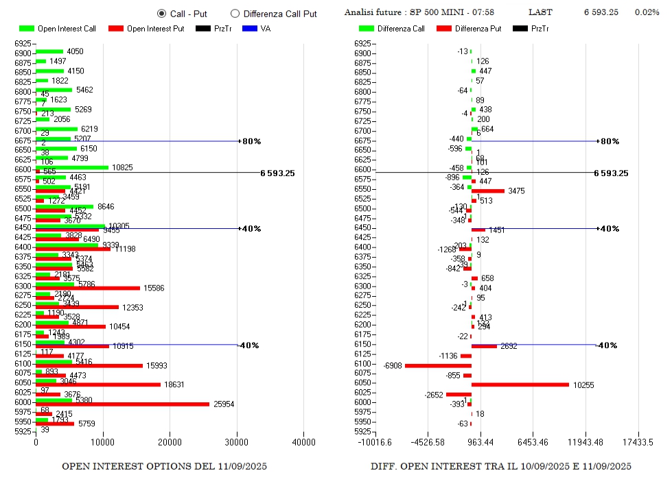 Nette chiusure di posizioni call da strike 6550 a strike 6675 e nuovi piccoli riposizionamenti sopra 6700. Sul lato put soliti importanti ingressi di contratti a 6550 e 6450.