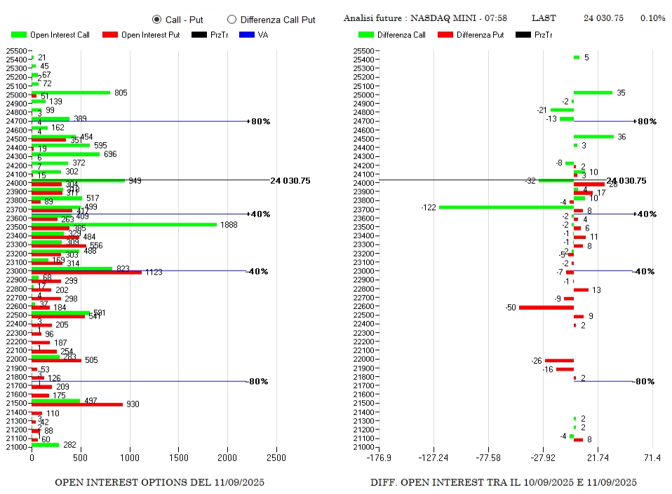 Anche qua si segnalano chiusure di call a 23700 e 24000 e riposizionamenti a 24500 e 25000 insieme a nuovi ingressi di put da strike 24000.