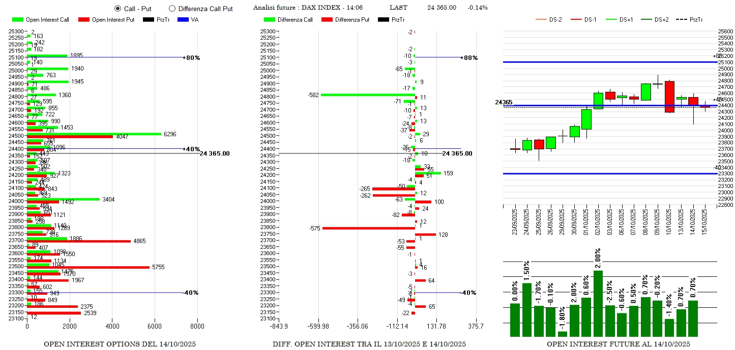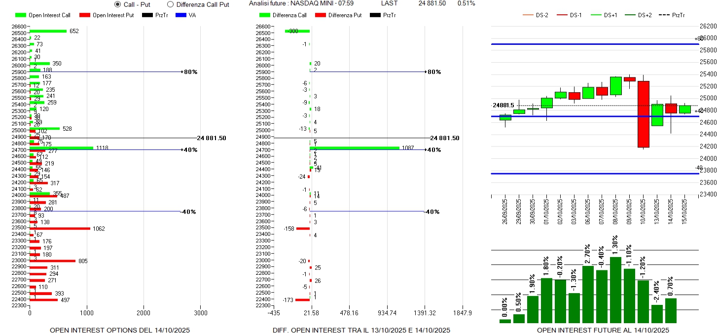 Si segnalano solo chiusure di put tra 24100 e 23800 e chiusure di calla 24800 come se ci fosse una situazione di panic selling. Future in aumento ma sempre sotto media.
