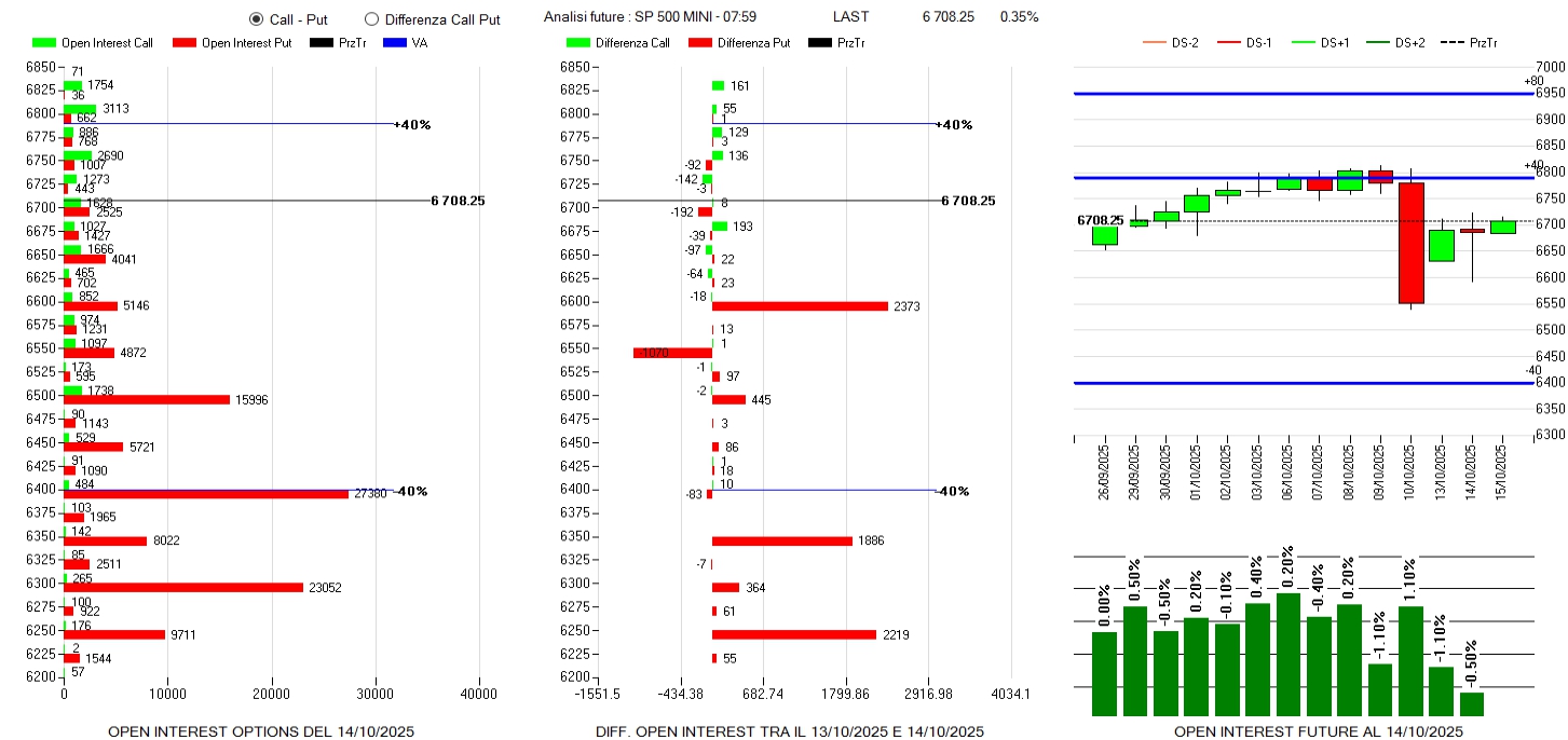 Mercato dominato da put con forti ingressi a strike 6600, 6350 e 6250. Poche call movimentate e future in ulteriore calo segno che ci troviamo in una area di prezzo dove non sono necessarie azioni di copertura.