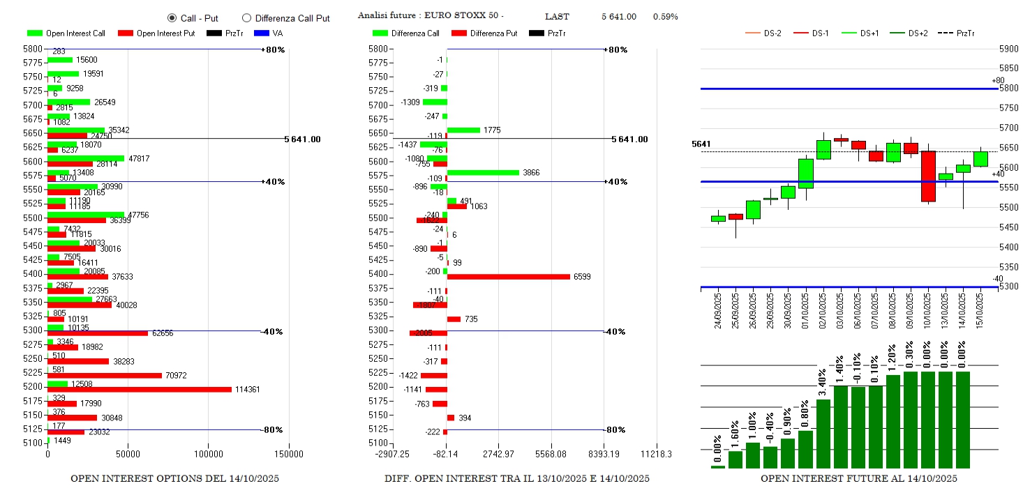 Anche su Stoxx sono ben visibili diffuse chiusure di calle put un pò su tutti gli strike e riposizionamenti di put a 5400 e di call a 5575 e 5650 andati attualmente Itm, insieme alla componente future sempre in massima pressione.