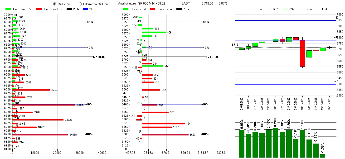 Mercato rientrato all’interno dell’area di indifferenza e forte calo della componente future di oltre il -1,30%. Sul lato opzioni si segnalano riposizionamenti di put tra 6600 e 6200 e di call tra 6775 e 6900, insieme alle solite ricoperture sintetiche tra 6650 e 6700.