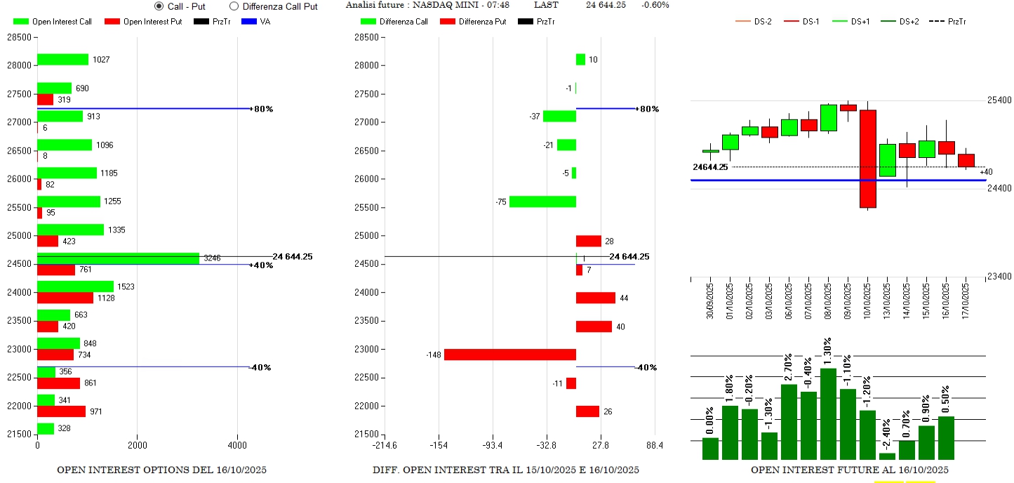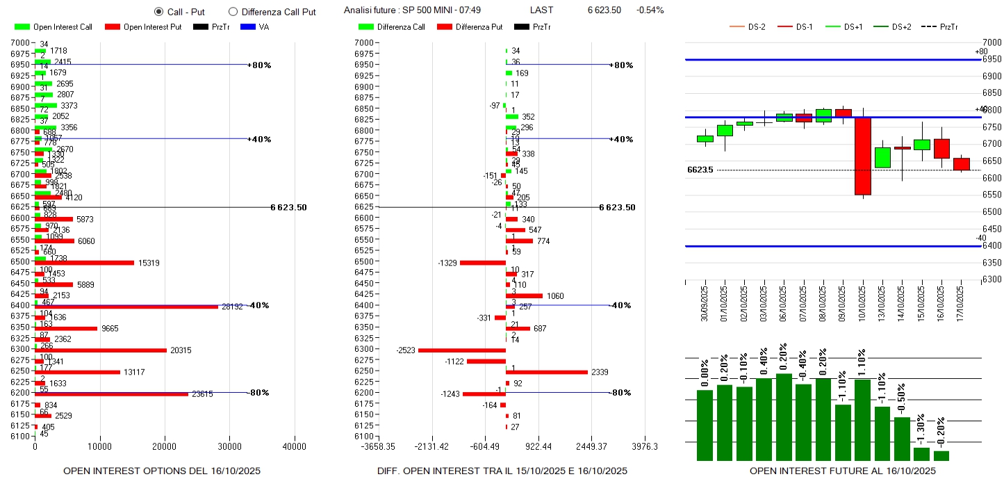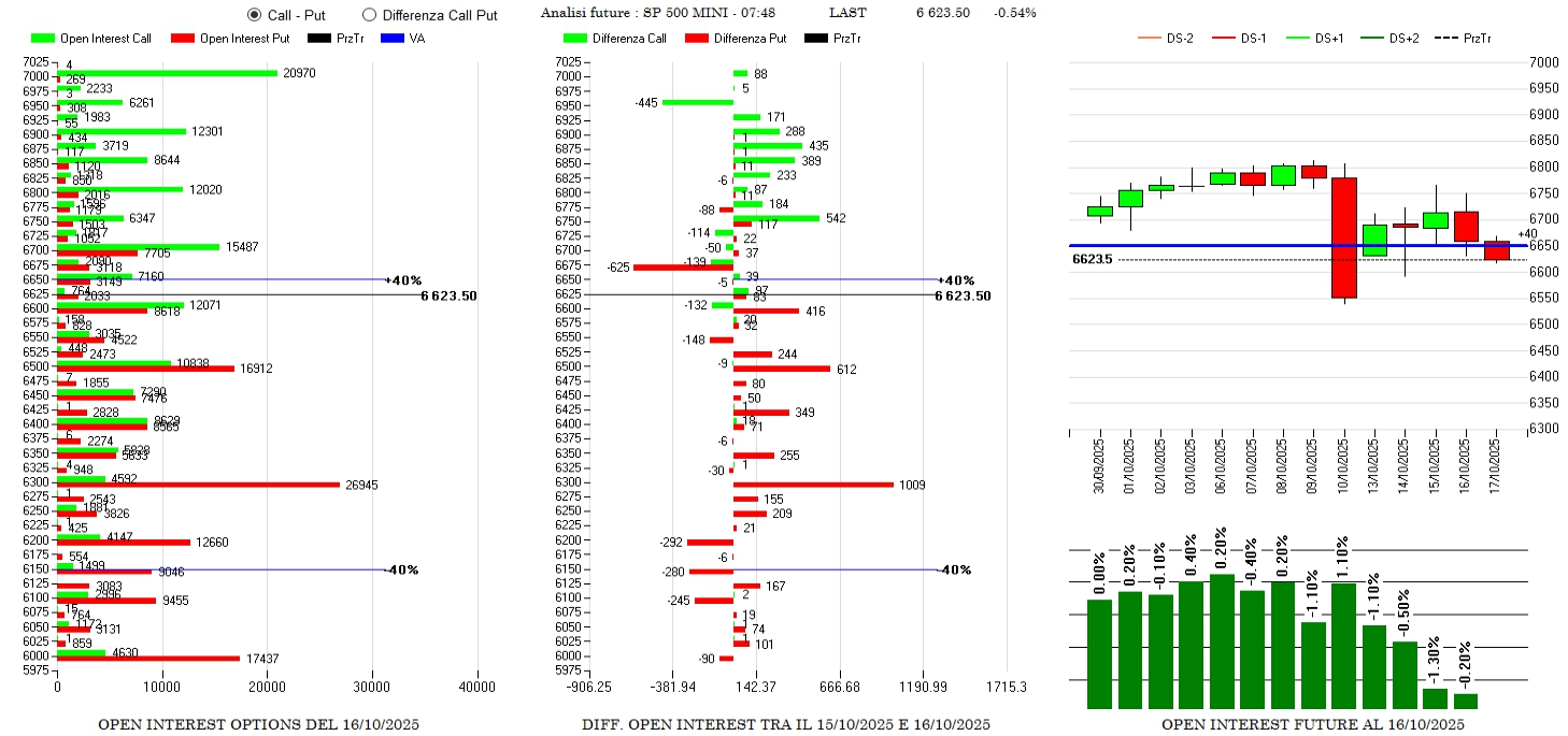 Prezzi centratissimi nel cuore della ripartizione e operatori che continuano a caricare put tra 6600 e 6200 e call tra 6775 e 6900. Ricoperture sintetiche a 6650/6675 e future in forte ulteriore calo e da quattro giorni non più in pressione rialzista e si segnalano anche chiusure di put a 6500 e 6300.