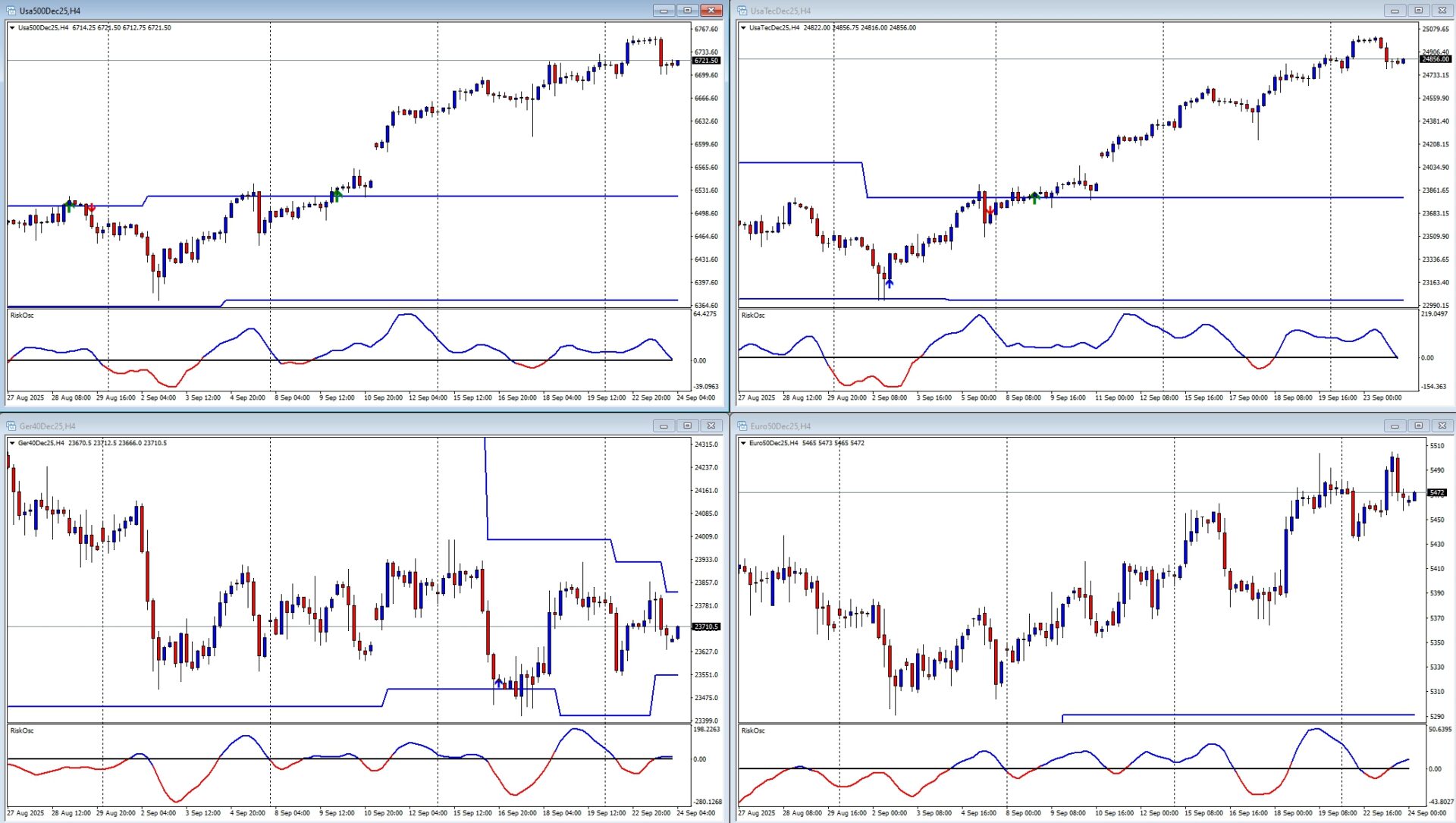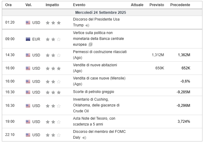 La giornata borsistica del 23 settembre ha mostrato una lieve debolezza tra i principali indici globali. S&P 500 e Nasdaq hanno registrato un calo dell’0,73% penalizzati dal settore tecnologico in flessione che li ha portati entrambi a testare, rompere e poi recuperare, il livello di gamma put. In Europa, sia il Dax che l’Euro Stoxx 50 hanno mantenuto i livelli di gamma con un rischio di correzione temporanea ma una tendenza rialzista di fondo. Il VIX ha registrato un aumento a 16,10 punti (+4,21%), segnalando un moderato incremento della volatilità attesa sui mercati, nell’attesa e durante il discorso del presidente della Fed Jerome Powell e delle dichiarazioni del Presidente Trump.