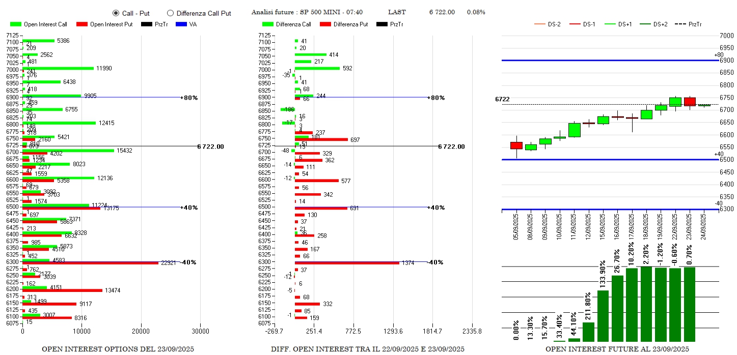 Nonostante la lieve flessione dei prezzi, la componente future non ha mollato la presa, anzi, ha segnato un lieve aumento dello 0,70% e, sul lato opzioni, continua il solito movimento che ha contraddistinto tutto questo anno: aumentano le put tra 6750 e 6300, vengono alleggerite call a 6800 e 6850 e vengono riposizionate a strike più alti 7000 e 7050.