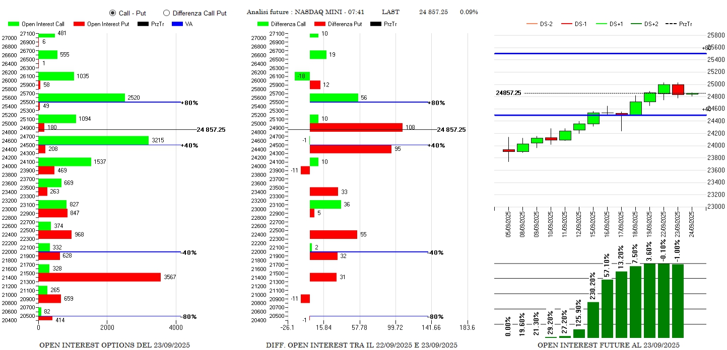 Anche sul Nasdaq sono evidenti gli ingressi di put da strike 25000 a strike 21500 e i riposizionamenti di call a 2550. Future in lieve calo del -1% ma pur sempre in pressione positiva sul gamma call.