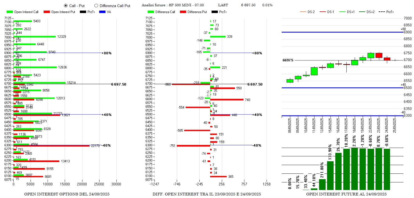 Riposizionamenti di put con rollover esterni contraddistinti da chiusure a 6700, 6550 e 6300 e nuove aperture a 6675, 6600 e 6500. Anche sul lato call si registrano piccoli alleggerimenti a 6900 e 6975 e nuovi ingressi a 6800 e 7000. Lato future senza variazioni di sorta e sempre in funzione di copertura della gamma call.