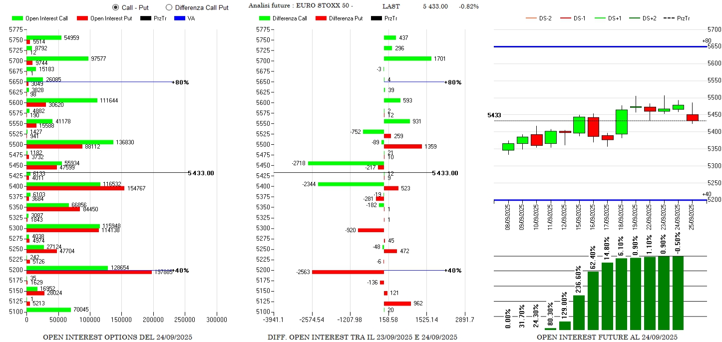 Chiusure di call e put tra 5450 e 5200. Nuovi riposizionamenti di call a 5700 e di put Itm a 5500. Future in lieve calo.