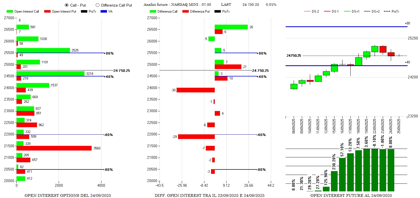 Anche su Nq si assiste a chiusure di put a 24000 e 22000 e a piccoli riposizionamenti a 24500 e 25000. Call in aumento a 26500 e future invariati.