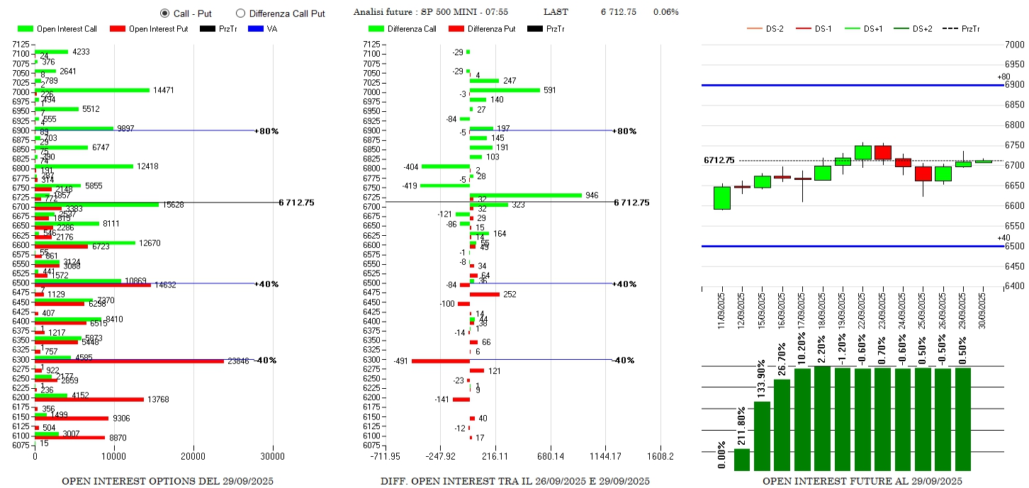 Aumentano call sopra al prezzo, da strike 6725 a strike 7000 e vengono riposizionati pochi contratti put a strike otm insieme a chiusure in area 6300. Future che rimangono sempre in pressione.