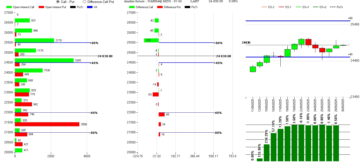 Chiusura di call a strike 25500 e 26500 e alleggerimenti di put a 23000 con nuovi ingressi a 22000. Future sempre in pressione e numericamente consistenti.