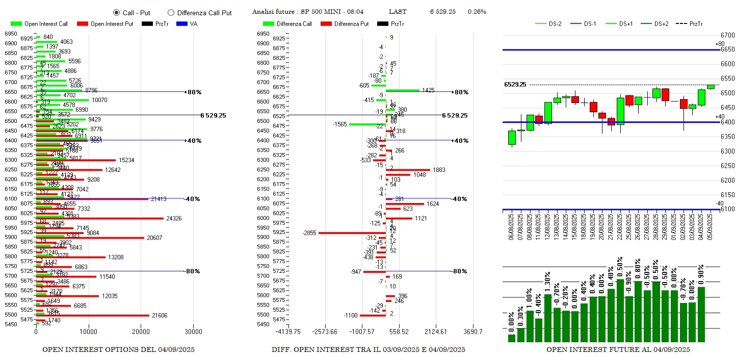 Come era facile immaginare, sulla rottura del livello di gamma call sono entrati e rimasti a mercato numerosi ordini condizionati di copertura, infatti la componente future è aumento del +0,9%. Sul lato opzioni si registrano chiusure di call a strike 6500 e riposizionamenti a 6575 mentre sul lato put piccoli alleggerimenti tra 6400 e 6300 e forti riposizionamenti tra 6250 e 6000.