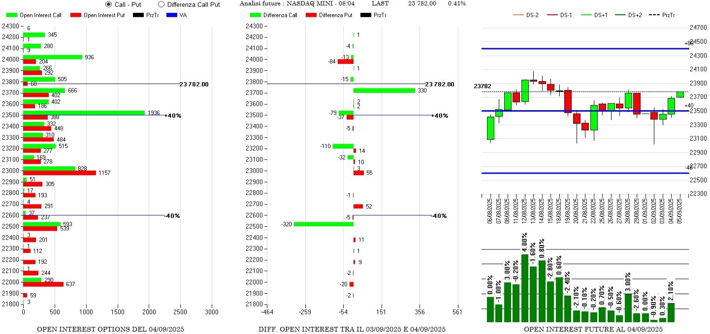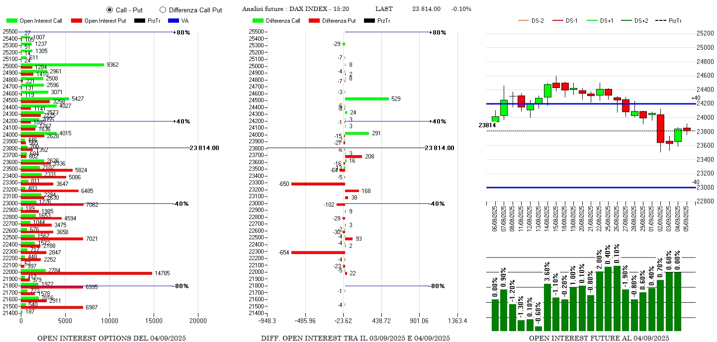 Anche su questo sottostante la pressione dei future in funzione di copertura è ben segnalata da un aumento del +2,10% del loro open interest mentre sulle opzioni si registrano chiusure di call a 22500 e 23500 e riaperture atm a 23700. Sul lato put chiusure di put Itm a 24000 e riaperture a 23000 e 22700.