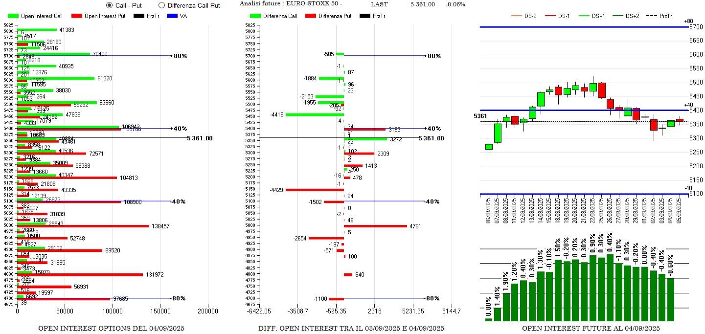 Chiusura di moltissime call tra 5450 e 5700 e apertura di posizioni call e put atm. Flussi di put in alleggerimento a 5100 e nuovi contratti a 5300 e 5000. Future ancora in flessione.
