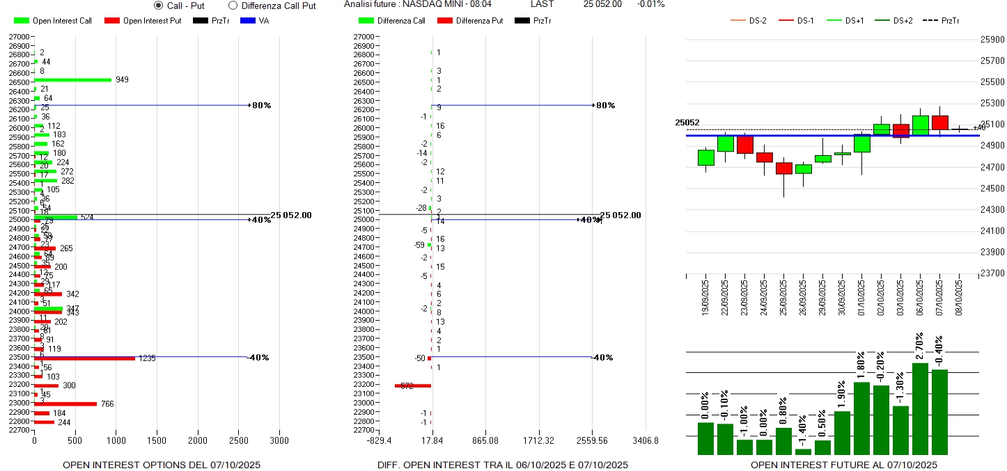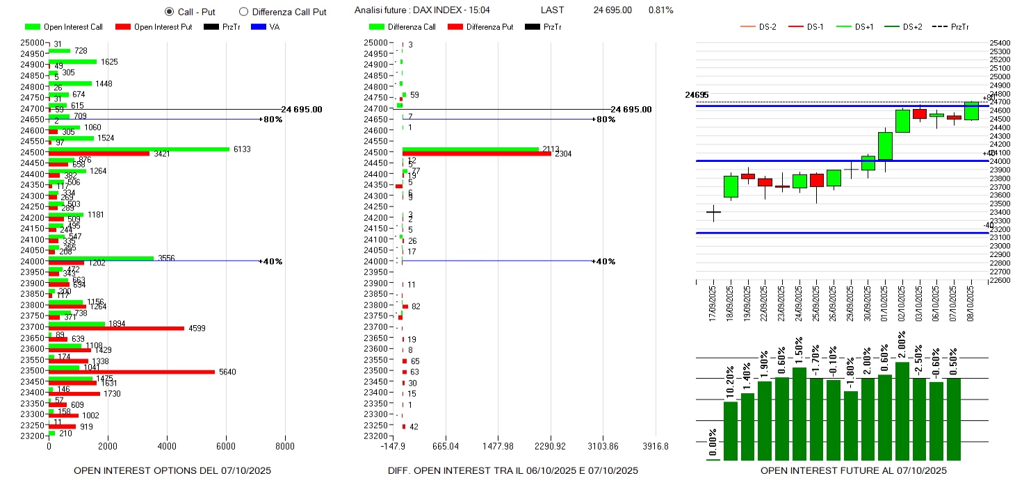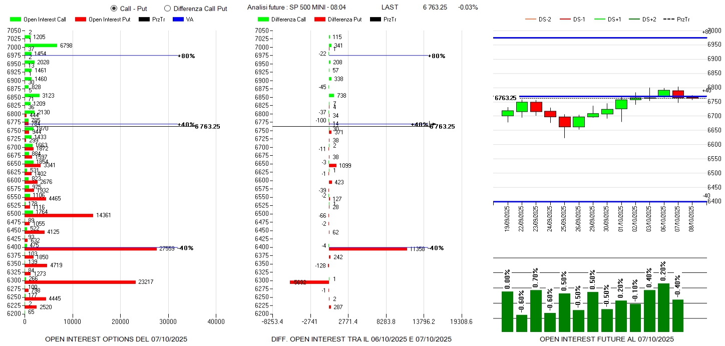 Continuano ad affluire put sotto al prezzo da 6750 a 6650 e con un picco di rilievo a 6400. Sul lato call solo riposizionamenti a strike 6850 e 6900 mentre la componente future, con i prezzi in debolezza, è in lieve calo del -0,4%.