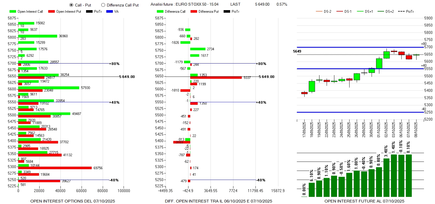 Future sui massimi di contratti e con pochissime variazioni e put in aumento a strike 5500 e call in rollover con chiusure a 5700 e aperture a 5750.