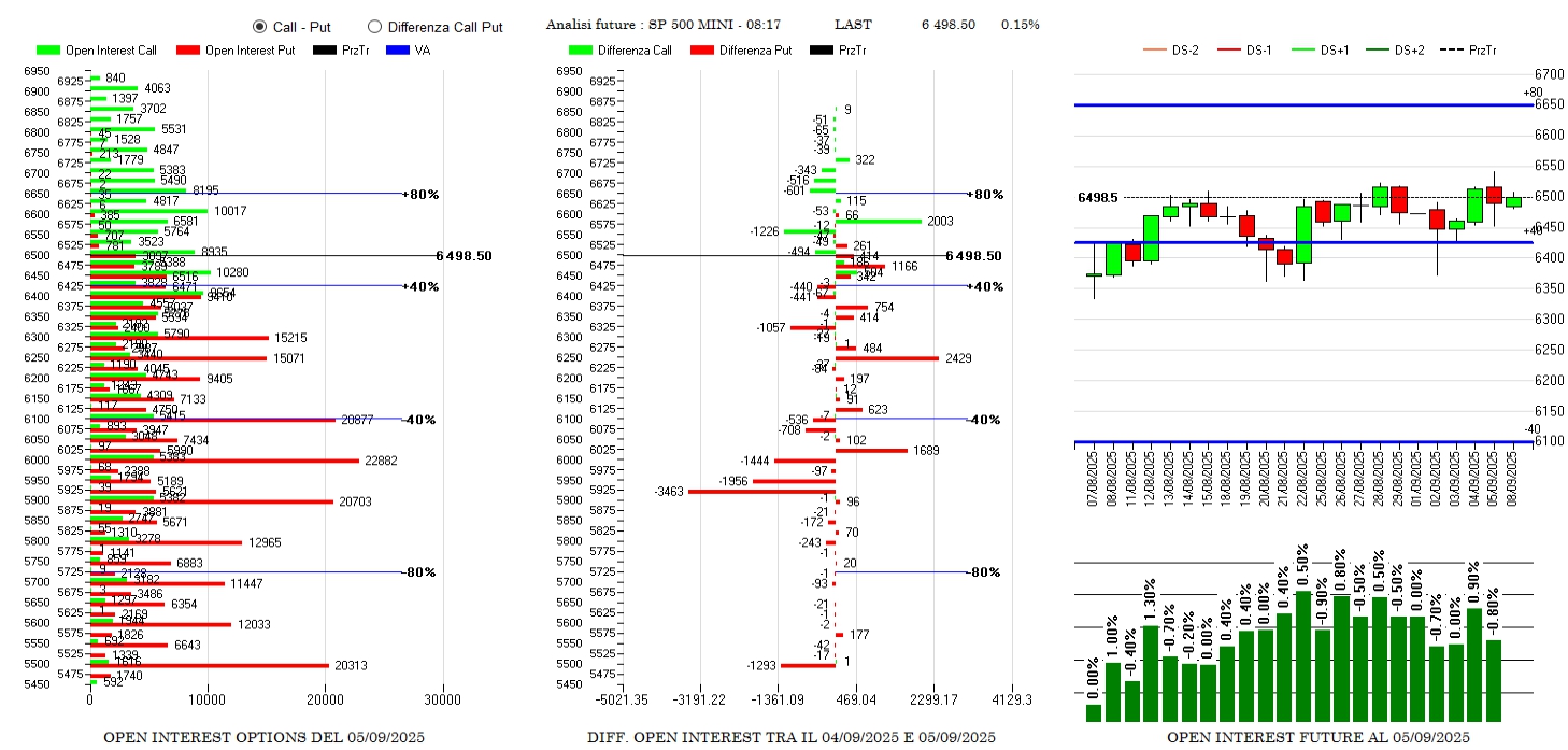 Riposizionamenti di put con chiusure in area 5950 e nuove aperture tra 6375 e 6000. Chiusure di call a 6700 e 6550 e nuove aperture a 6675. Future in lieve calo.