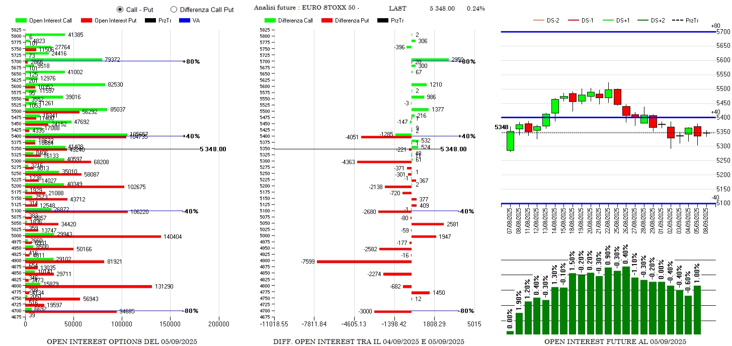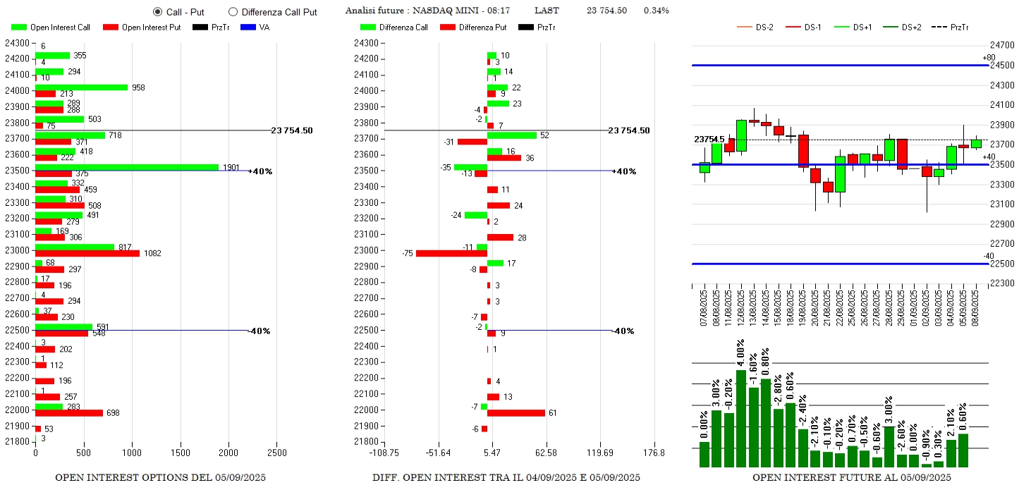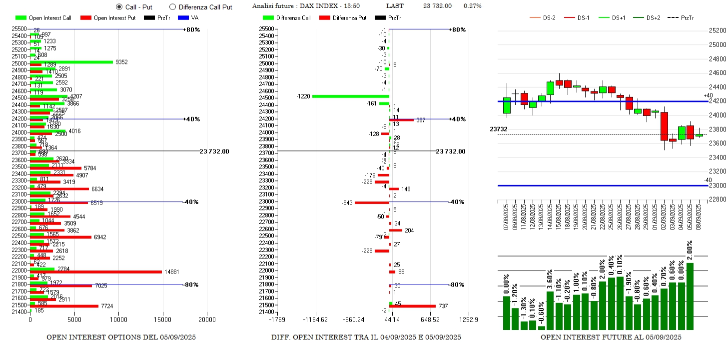 Chiusure di call a 24500 e chiusure di put tra 23500 e 22400 con nuovi posizionamenti a 24200 e a 21500. Future in forte rialzo sulla debolezza segno che il momentum del Dax è ribassista.