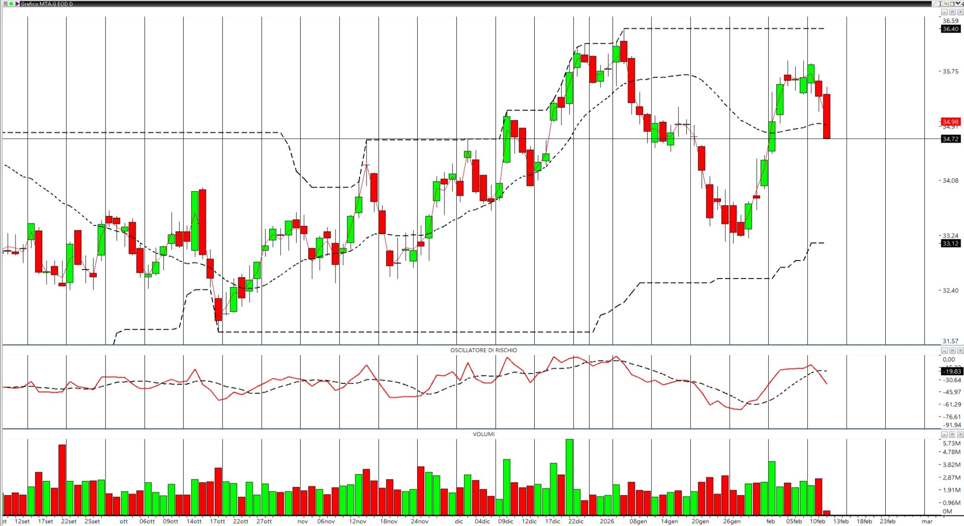 Dopo aver fatto nuovi massimi assoluti a 36,40, il titolo Generali ha perso smalto e, nel più classico dei ritracciamenti ha trovato un minimo, in area 33,12, da dove è ripartito con forza e momentum. Attualmente i prezzi stanno confermando comunque debolezza e hanno tagliato al ribasso la Regressione lineare che ha girato in pendenza negativa. Anche l’oscillatore di rischio ha incrociato la propria media mobile alla ricerca di una nuova area di equilibrio da dove fare accettazione.