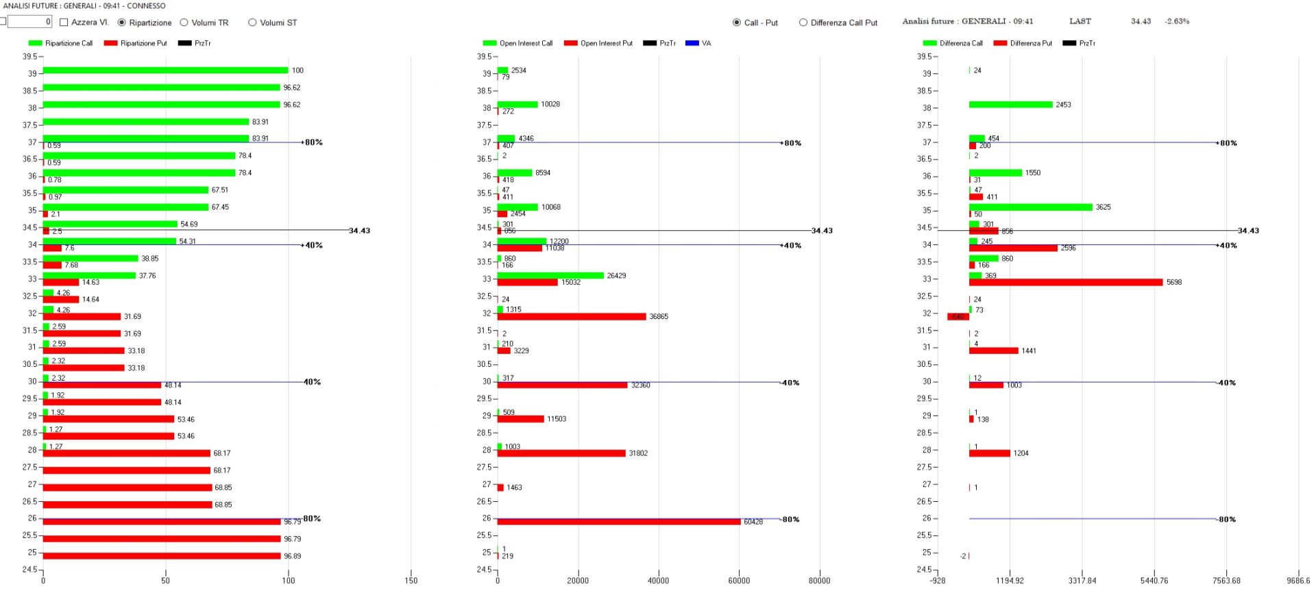 Sul grafico dei totali è immediato notare come tutta la salita sia stata sostenuta da enormi flussi di put su tutti gli strike da 28 a 32. Da segnalare le ricoperture sintetiche in tendenza long effettuate a strike 33 e 32 e le prime aree di gamma resistenza a 36 fino a 38