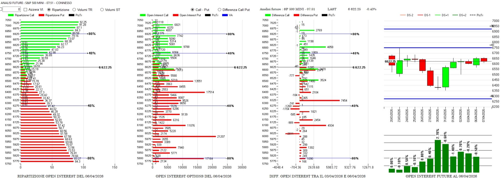 L’aggiornamento al 6 aprile 2026 mostra un S&P 500 Mini a quota 6622.25, in una fase di consolidamento in area di massimi relativi. La dinamica dei future è l’elemento più rilevante di questa sessione: l’istogramma evidenzia una progressiva diminuzione della pressione, scendendo prima allo 0,70%, poi allo 0,20% e infine attestandosi a un valore negativo dello 0,50%. Questo declino costante indica che gli operatori corti di Gamma hanno sensibilmente ridotto la necessità di delta-hedging. Nello specifico, la pressione di vendita dei dealer per coprire le put è quasi del tutto evaporata, mentre la stabilità sopra i 6600 suggerisce che i venditori di call non abbiano particolari necessità di copertura.
