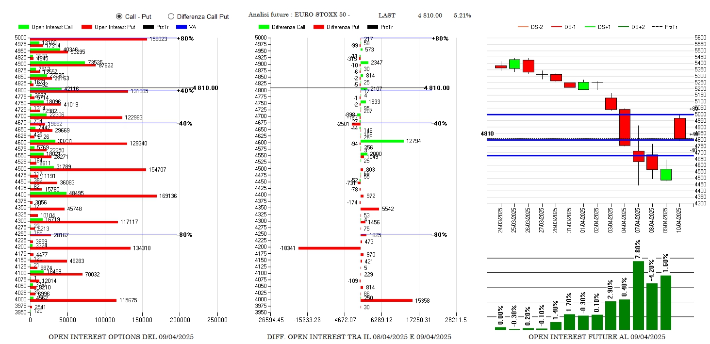 Nonostante il rialzo sono state comunque chiuse tantissime posizioni put da strike 5500 a strike 4950 e aperte a 4900 e 4600. Sul lato call si segnalano tanti ingressi a partire da strike 5100 fino a 5500 che sono già diventati Itm. Conferma dello short squeeze arriva dal repentino calo dei future che segna -2,5%. Prezzi rientrati esattamente nel cuore della ripartizione.