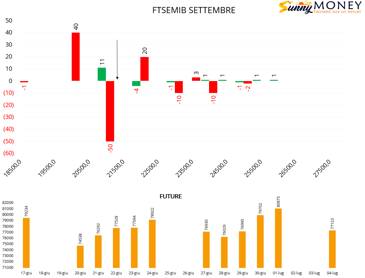 Sul Ftsemib chiusure di put a strike 21000 e nuove aperture a strike 20000 e 22500. Future in calo e disinteresse degli operatori a lavorare il lato call.