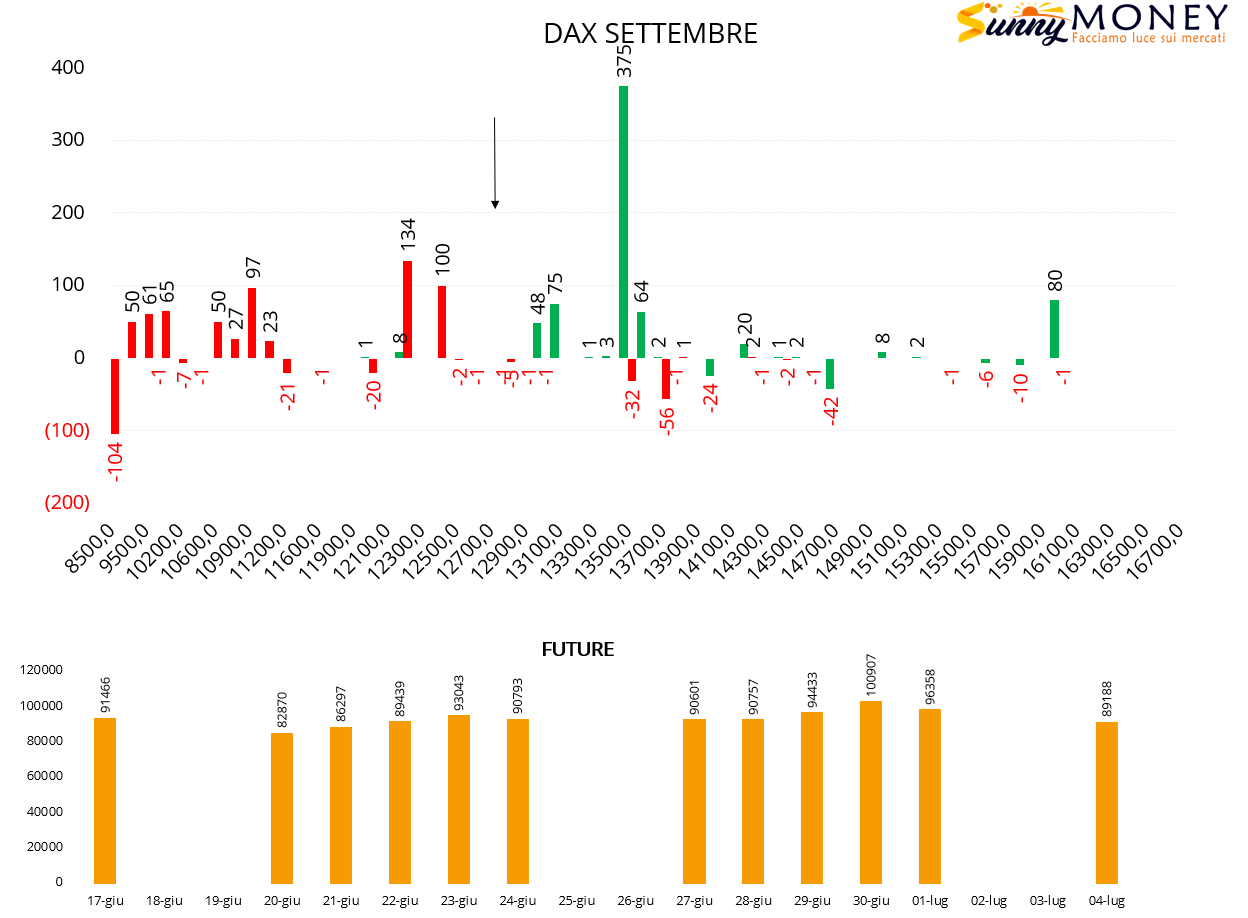 Sul Dax ingresso di call a strike 13500 e nuovi posizionamenti di put a partire da strike 12500. Ampia area di lavoro fra questi due livelli e future in netto calo.